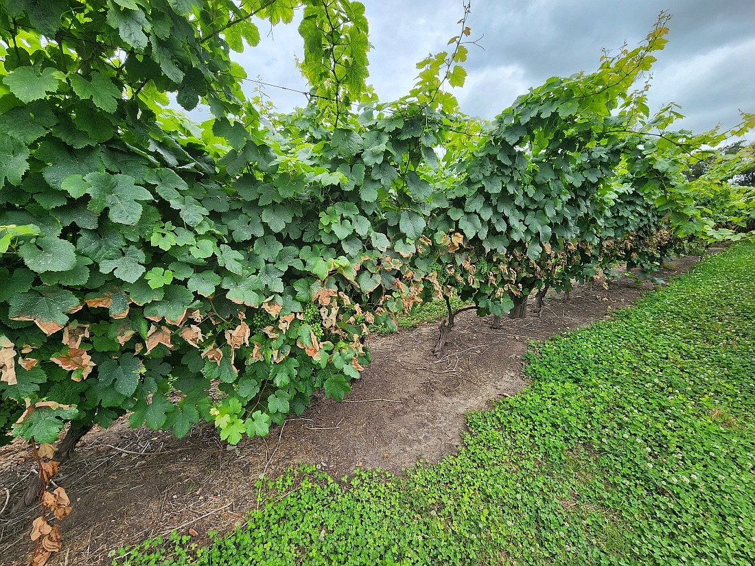 Explication pour ces feuilles de vignes jaunies: brûlées par le soleil!?, plutôt desherbant pour éviter d'enlever les feuilles