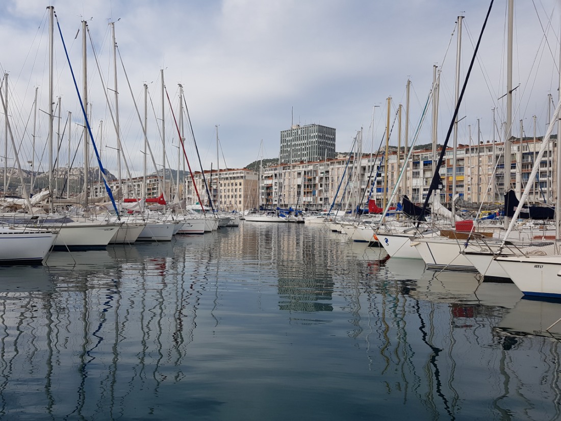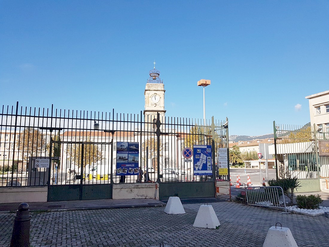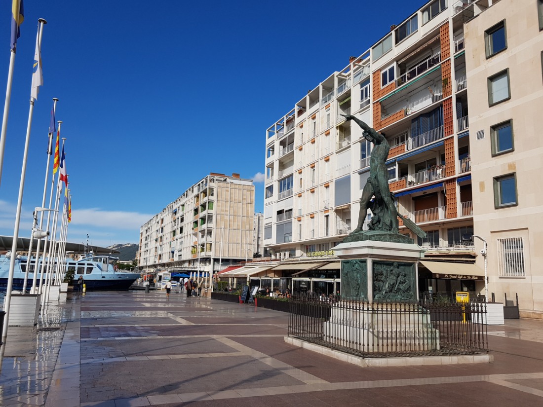 Préfecture du Var et principale base navale française, située entre mer et montagnes. Un coquillage, le "murex", gros escargot de mer est à l'origine de la ville, récolté uniquement à Toulon, les Romains s'en servaient une fois écrasé pour teindre les toges en pourpre. Au Moyen Age, la petite ville est bien à l'abri derrière ses remparts, elle vit de l'artisanat et du commerce de son port. Après le rattachement de la Provence à la France, Toulon devient un lieu de construction navale sous Charles VIII et sa rade est utilisée pour abriter des flottes militaires. Vauban fortifie la ville qui reçoit l'escadre méditerranéenne de Louis XIV. L'histoire va prendre un tournant important avec le développement du port et la création de l'arsenal au XVIème siècle. Les navires de guerre y sont désormais amarrés. Avec le besoin de main-d'oeuvre, de plus en plus de personnes s'installent. Les remparts sont déplacés vers l'extérieur, ils le seront une seconde fois au XIXème siècle, où, par la même occasion, la ville sera modernisée, cette période correspond au règne de Napoléon III. La seconde guerre mondiale détruit la moitié de la ville dont les maisons du port. L’architecte Jean de Mailly qui signe la conception de la "Frontale" (les immeubles reconstruits du Port) reçoit le grand prix d’honneur à la Triennale de Milan.