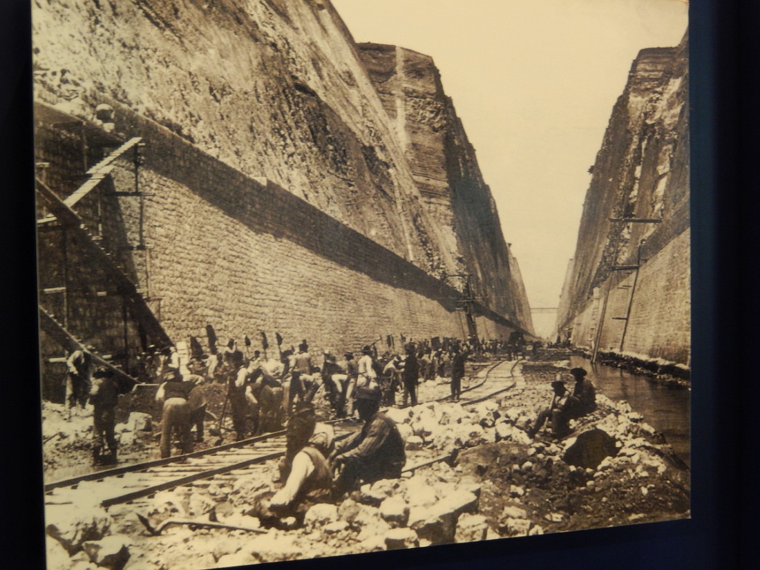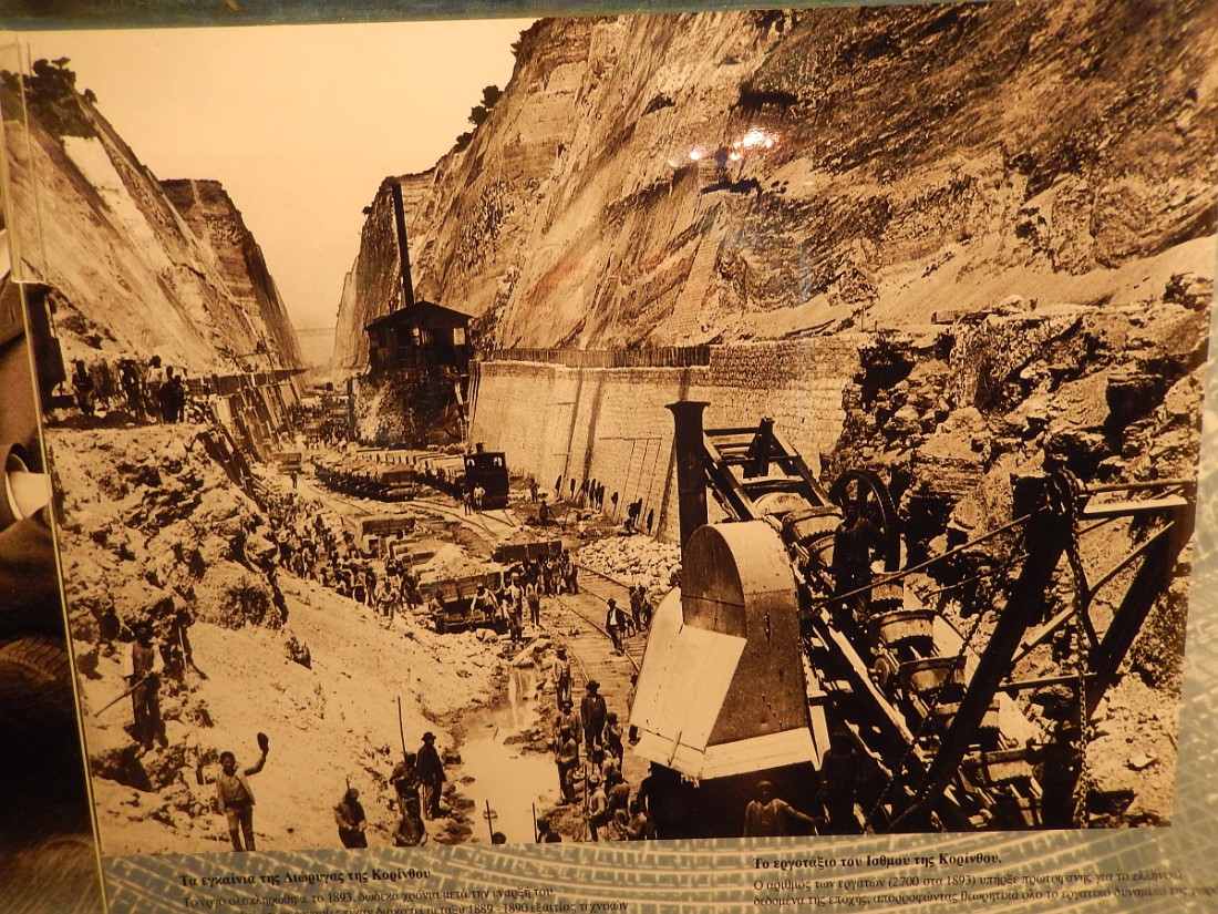 Les travaux, commencés le 29 mars 1882, se révèlent beaucoup plus difficiles que prévu, compte tenu d'études géologiques incomplètes. Ils devaient durer cinq ans, mais les difficultés vont faire douter les investisseurs de la solvabilité de l'opération financière. La société n'arrive plus à lever des fonds à la Bourse de Paris à la suite de la faillite de la Compagnie chargée du canal de Panama. La société est en banqueroute en juillet 1889. Les travaux s'arrêtent alors que 8 200 000 m3 ont été terrassés et qu'il en reste 2 600 000 m3. Une nouvelle société grecque qui reprend la construction en 1890. L'inauguration a lieu le 25 juillet 1893. La mise en circulation a lieu en janvier 1894 et le premier bateau à traverser le canal est un navire français de 110 m de long et 13 m de large: le Notre Dame du Salut.