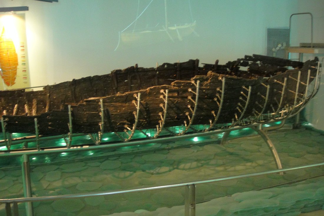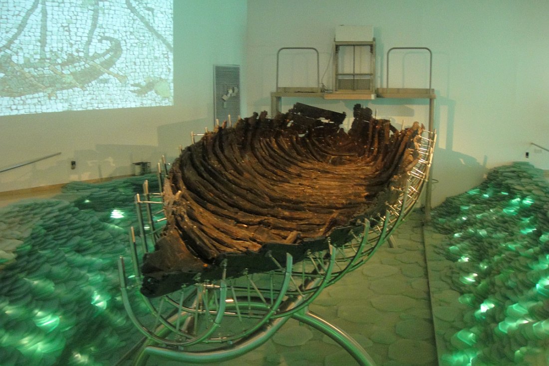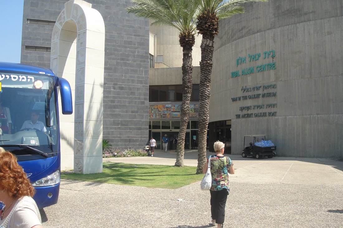 Yigal Allon Center dans le kibboutz Ginosar où est exposé une barque de pêche de l'époque de Jésus, dégagée du lac de Tibériade qui a nécessité onze années de restauration. Longueur 8,20m, largeur 2,30m, hauteur 1,20m.