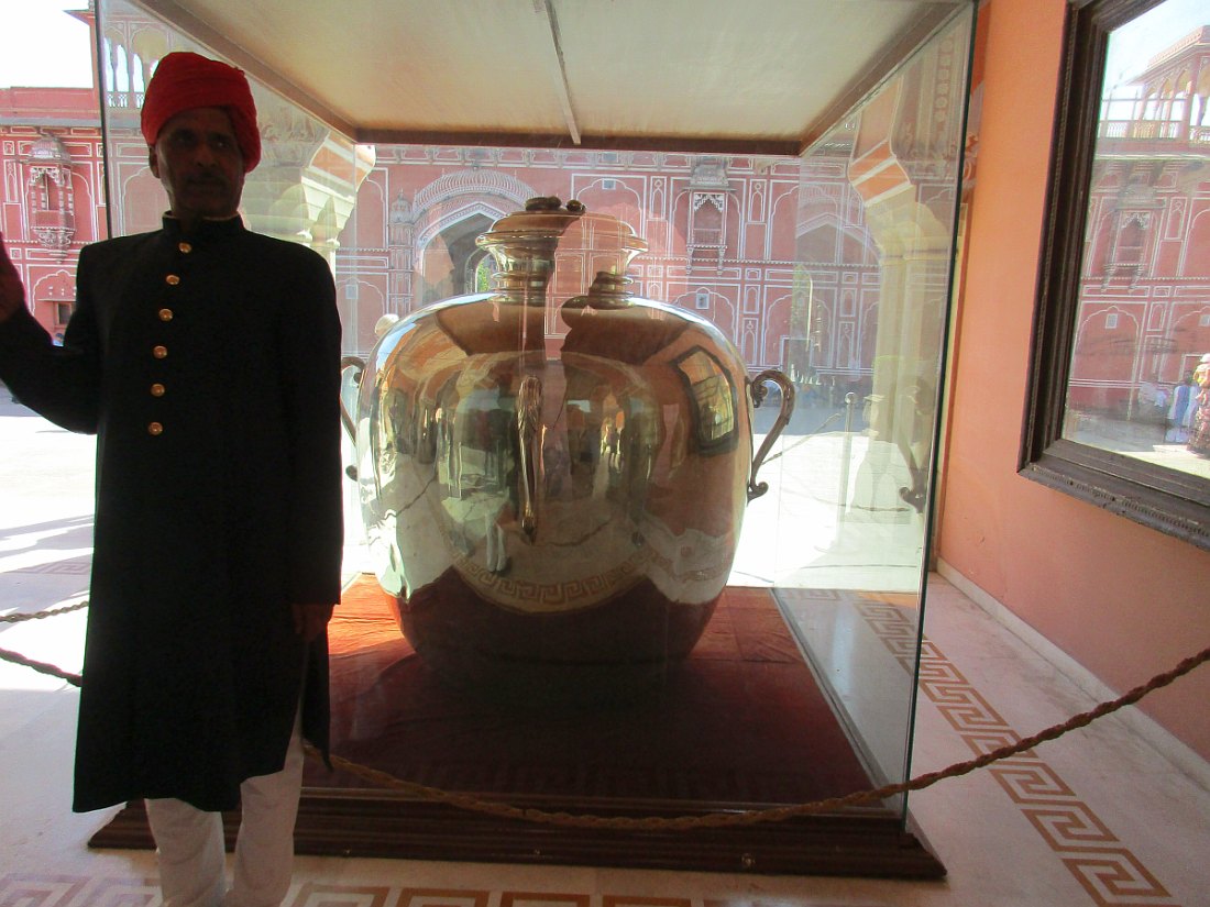 GANGAJELIES - Deux énormes jarres d'argent fabriquées par deux orfèvres, sans aucune soudure à partir de 14 000 pièces de monnaie d'argent chacune, chaque Gangajeli pèse 345 kg pour 1,60 m de haut et 4,30 m de circonférence. Elles ont été emportées par le roi Sawâî Jai Singh II lors de son voyage en Angleterre pour le couronnement du roi Edouard VII en 1902. Chaque jarre transportait 4 100 litres d'eau du Gange, le maharadja très pieu ne pouvant commettre le péché de consommer l'eau anglaise.