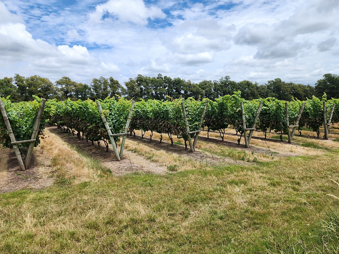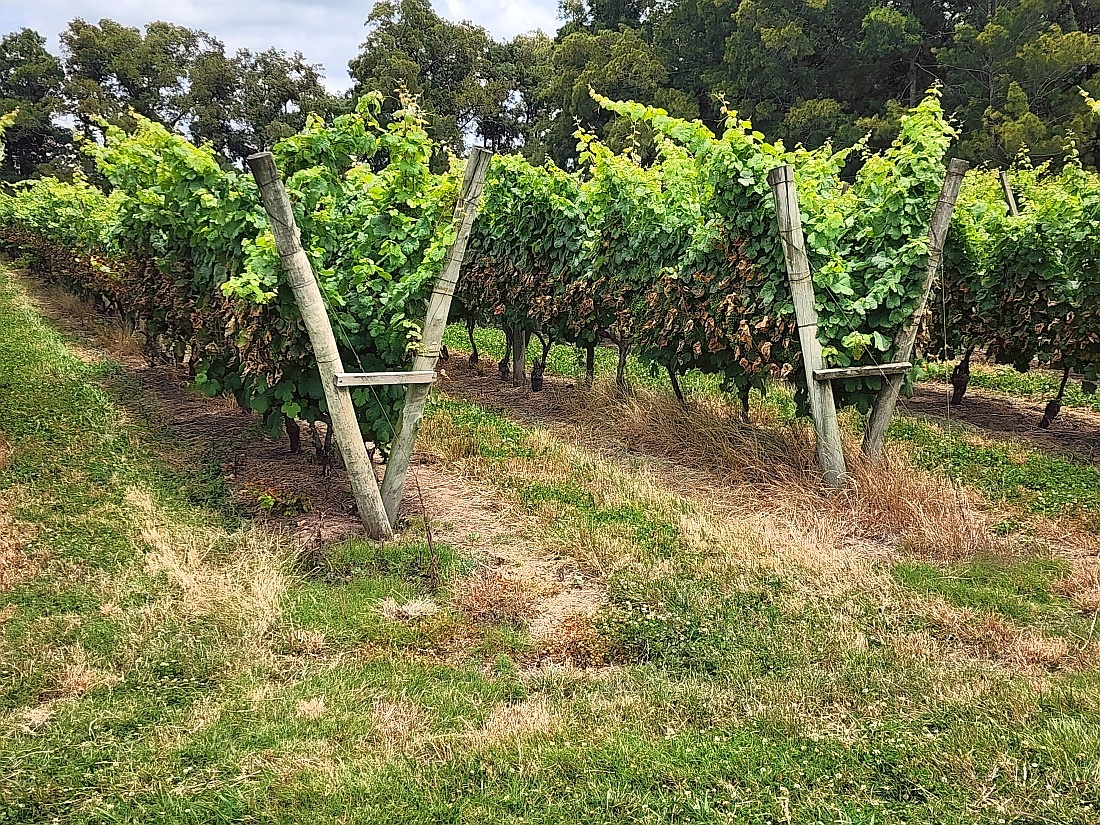 Explication pour ces feuilles de vignes jaunies: brûlées par le soleil!?, plutôt desherbant pour éviter d'enlever les feuilles