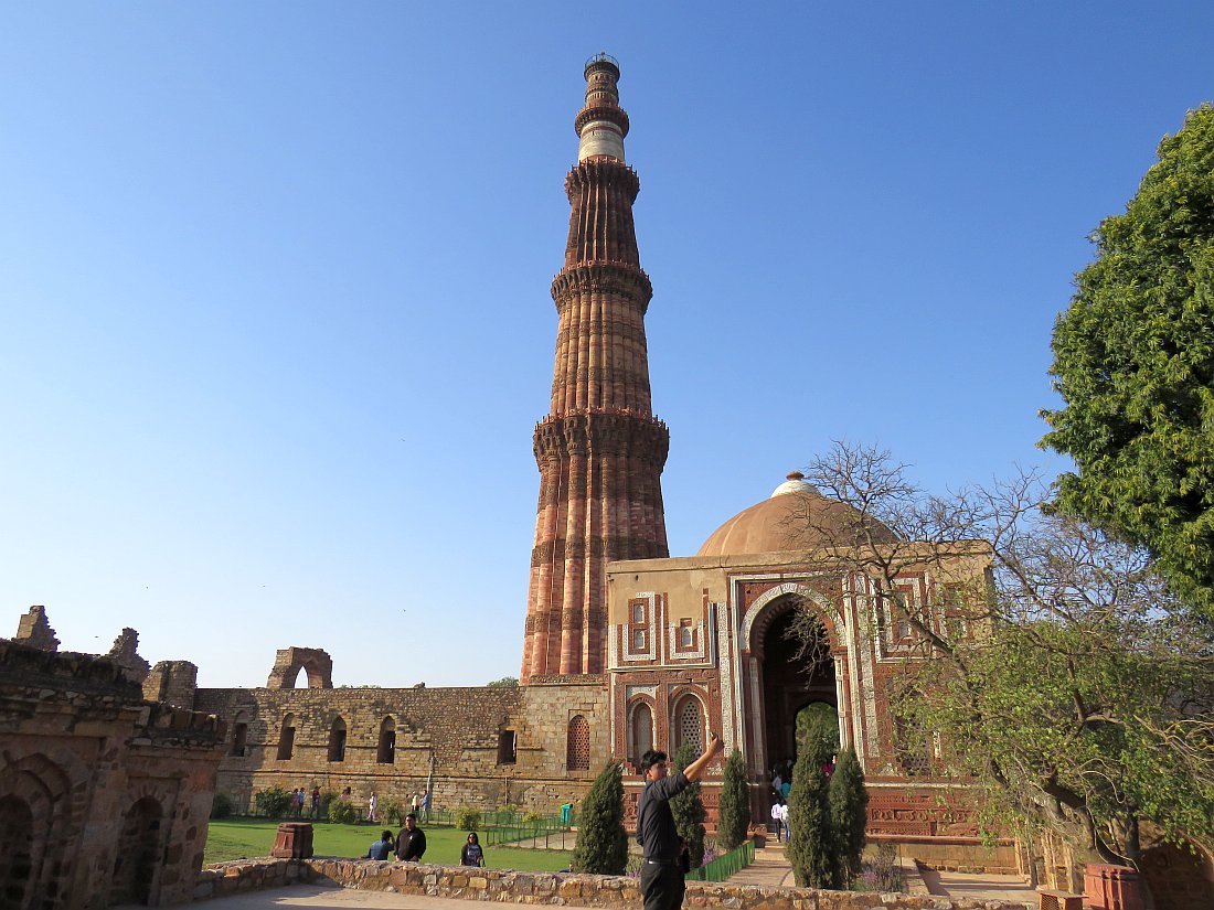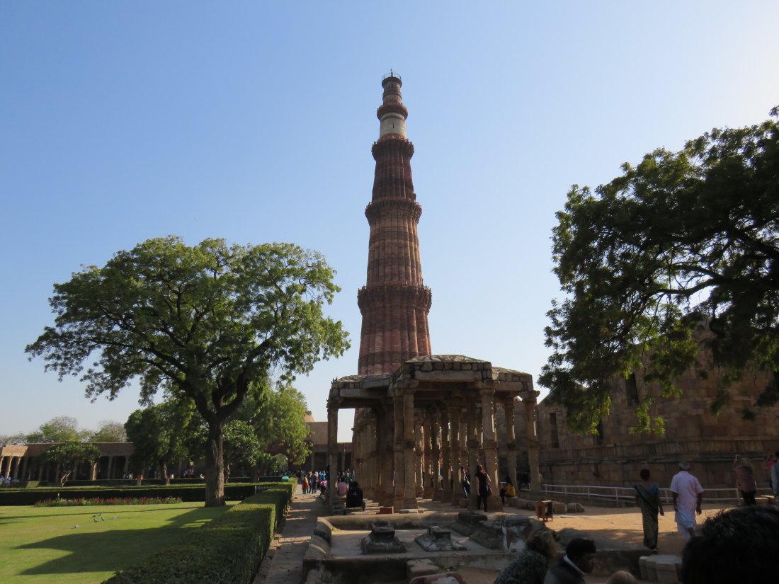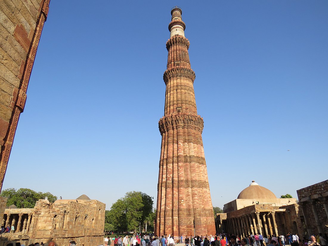 QUTUB MINAR - Cette tour de marbre et de grès rouge est le plus haut minaret d'Inde avec ses 73 mètres, bâti après la défaite du dernier royaume hindou de Delhi en 1193, il marque le début du règne musulman dans le pays. Les fondations furent bâties en 1200 et le dernier étage fut achevé plus de 150 ans plus tard. Au pied de la tour s'élèvent les ruines de la Quwwat-ul-Islam, considérée comme la première mosquée d'Inde. Elle a été construite avec des matériaux provenant de la démolition de 27 temples hindous.