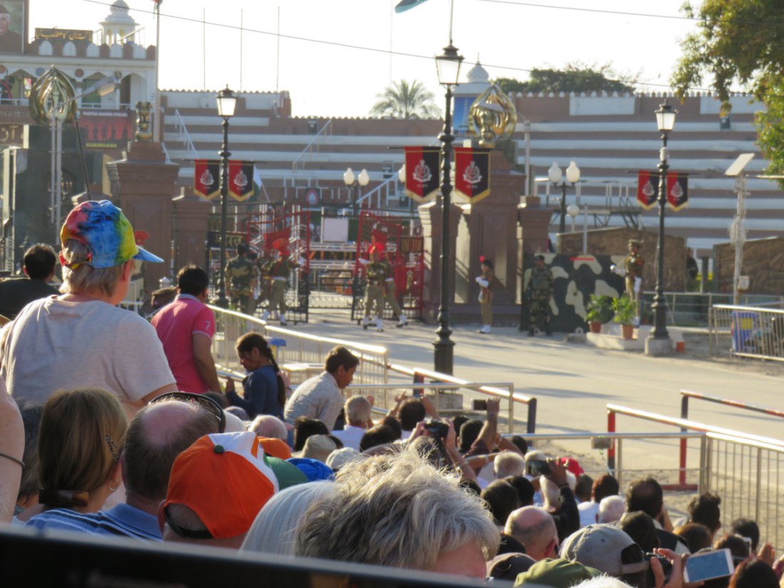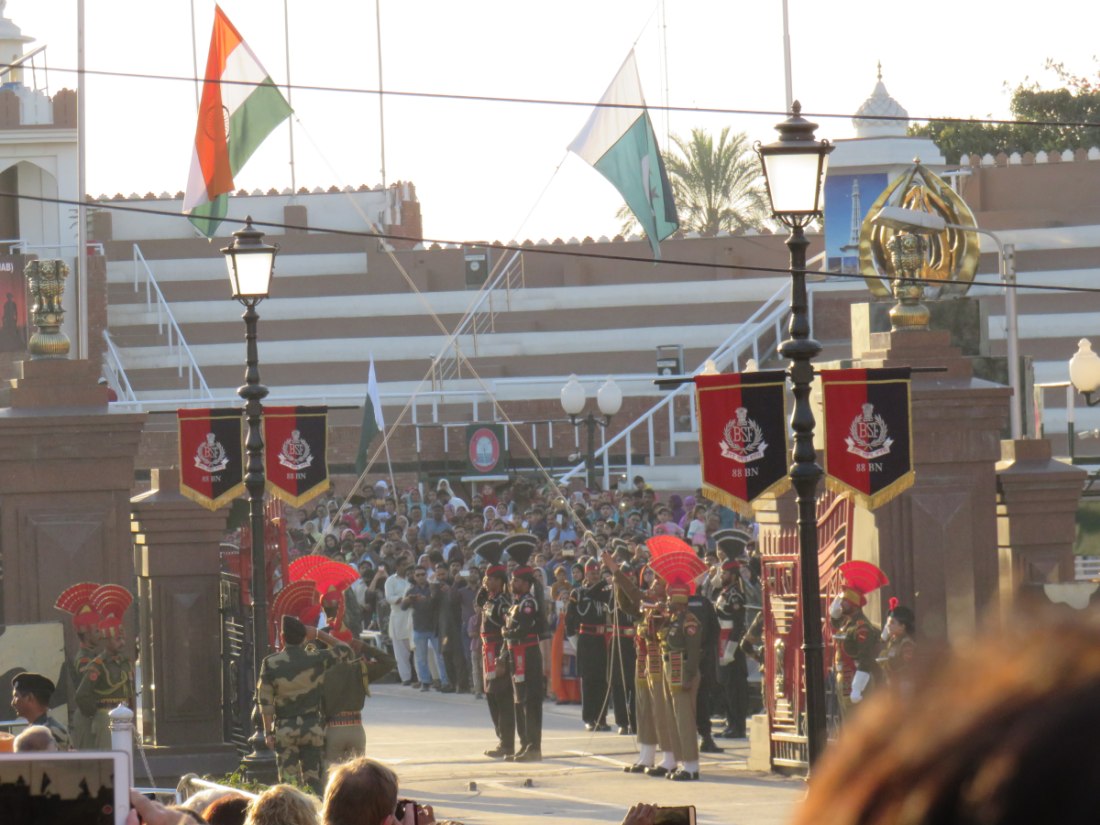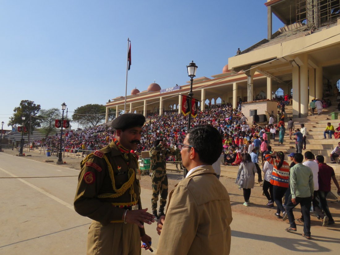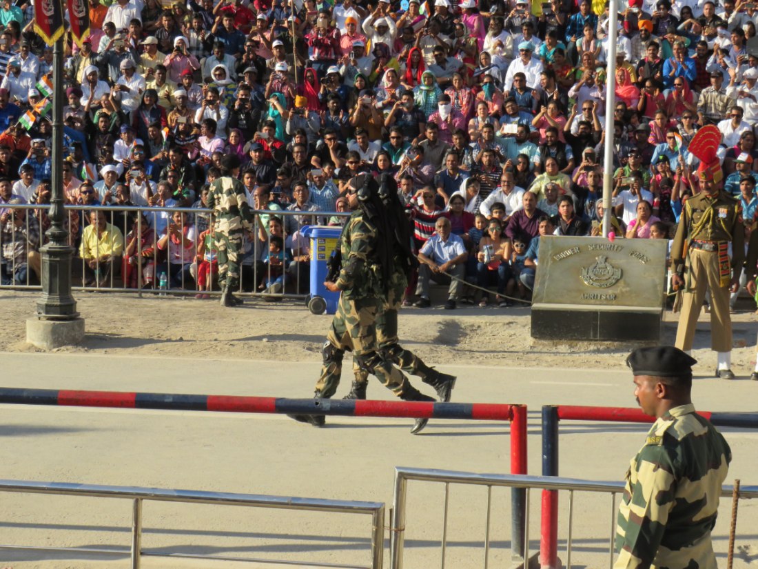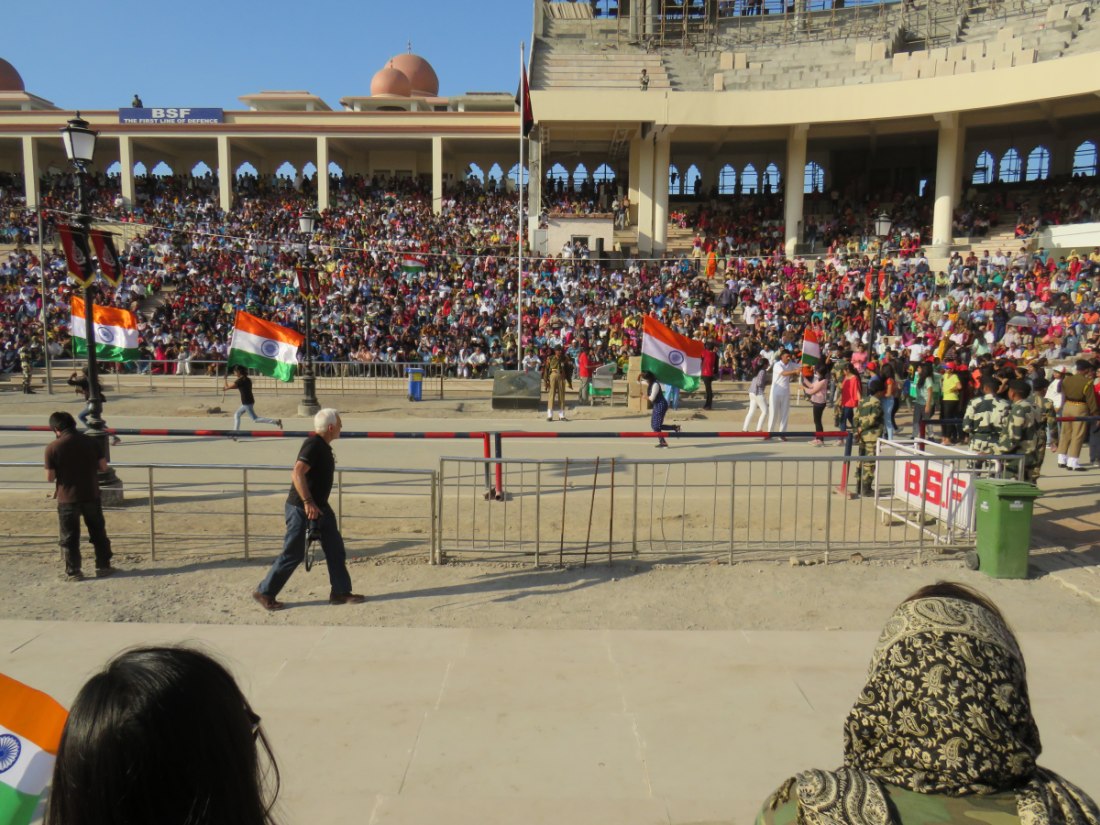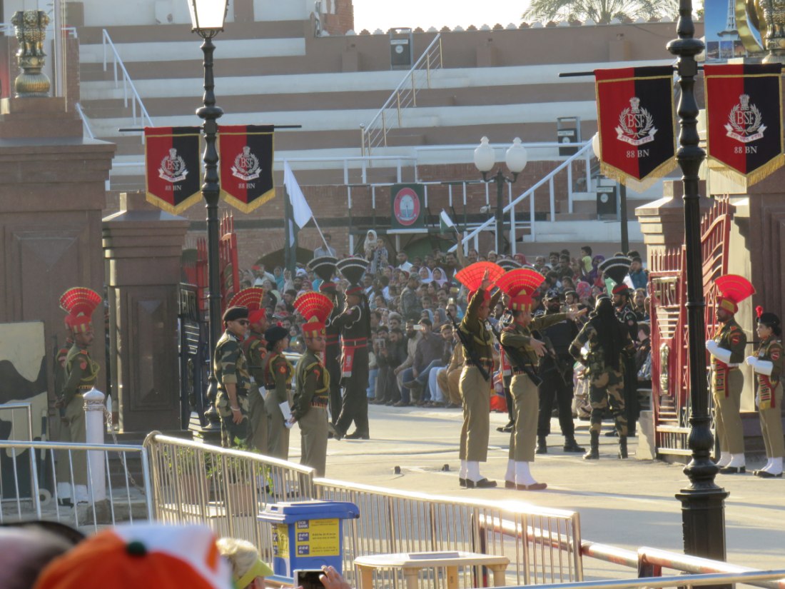Relève de la garde à Attari sur la frontière avec le pakistan. Après avoir passé un poste de contrôle et de nombreux militaires, grande parade-spectacle devant une foule colorée de plusieurs milliers de personnes en liesse, sous bonne garde dans une arène en phase d'agandissement.