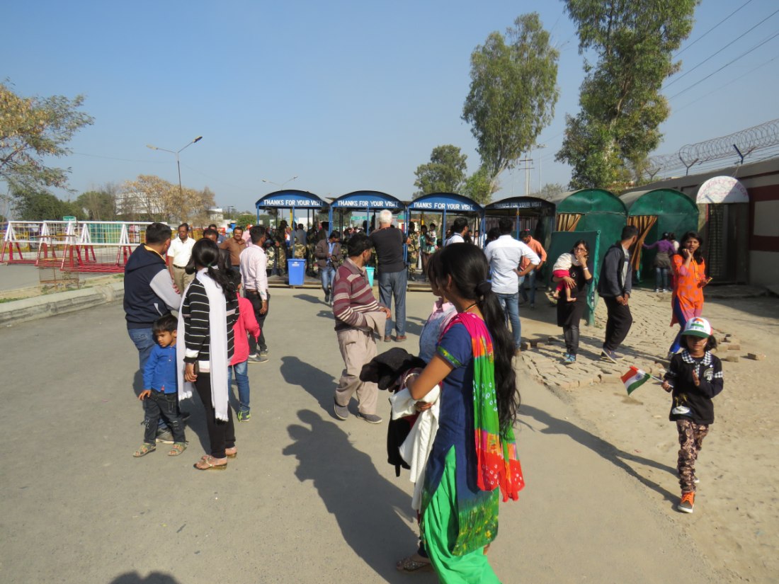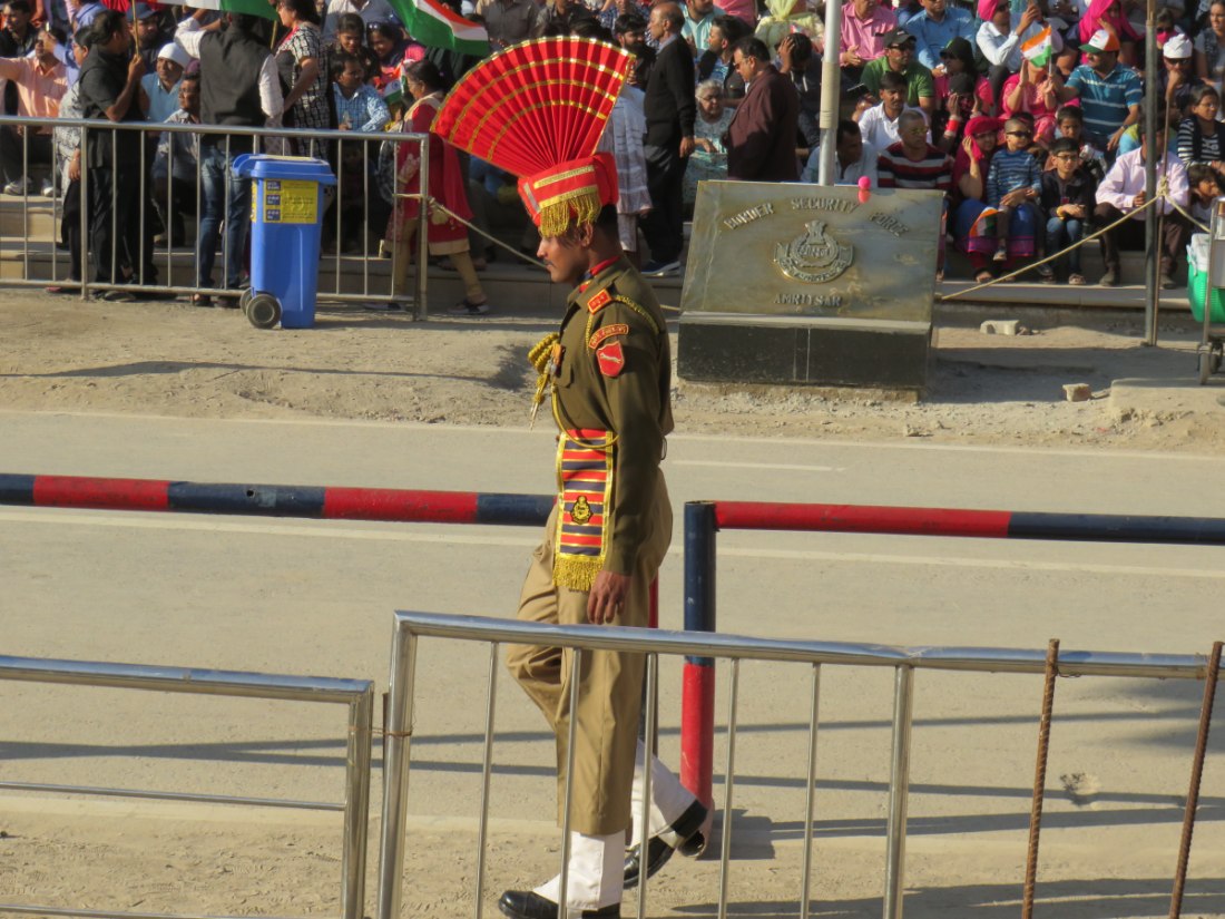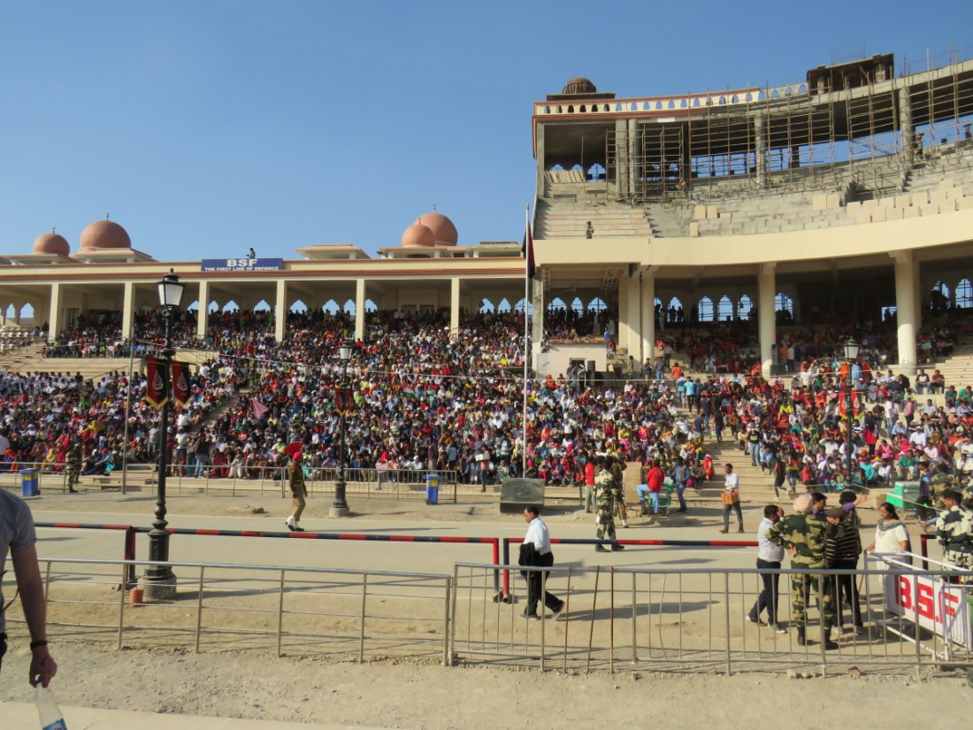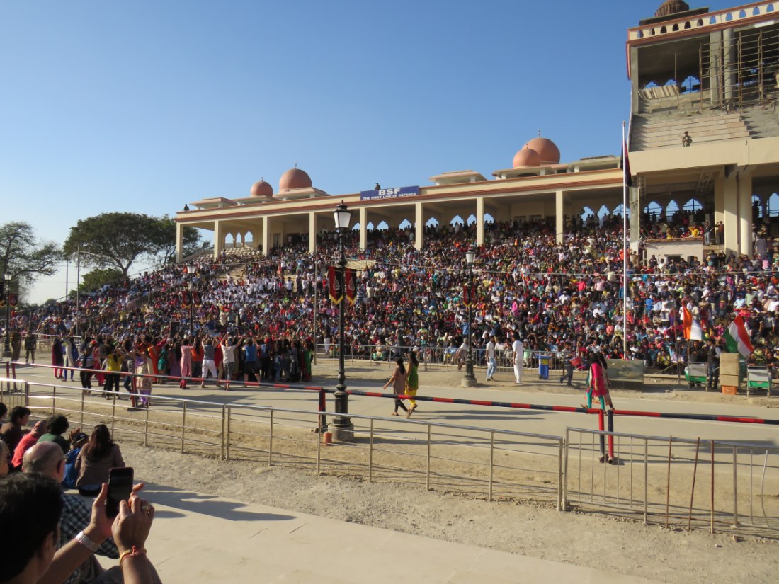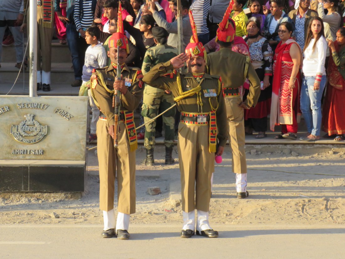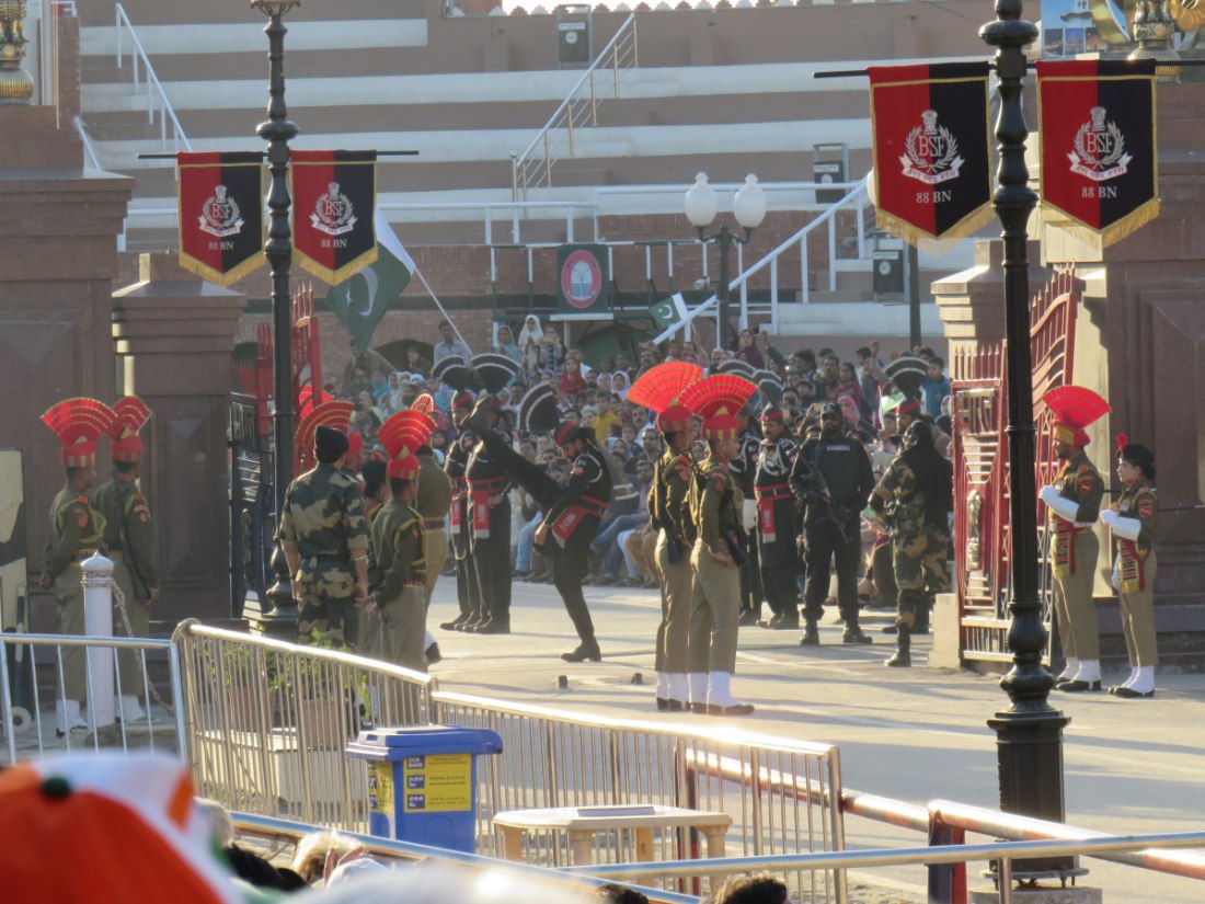 Relève de la garde à Attari sur la frontière avec le pakistan. Après avoir passé un poste de contrôle et de nombreux militaires, grande parade-spectacle devant une foule colorée de plusieurs milliers de personnes en liesse, sous bonne garde dans une arène en phase d'agandissement.
