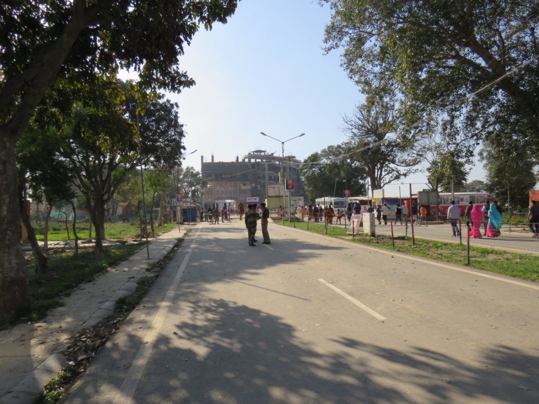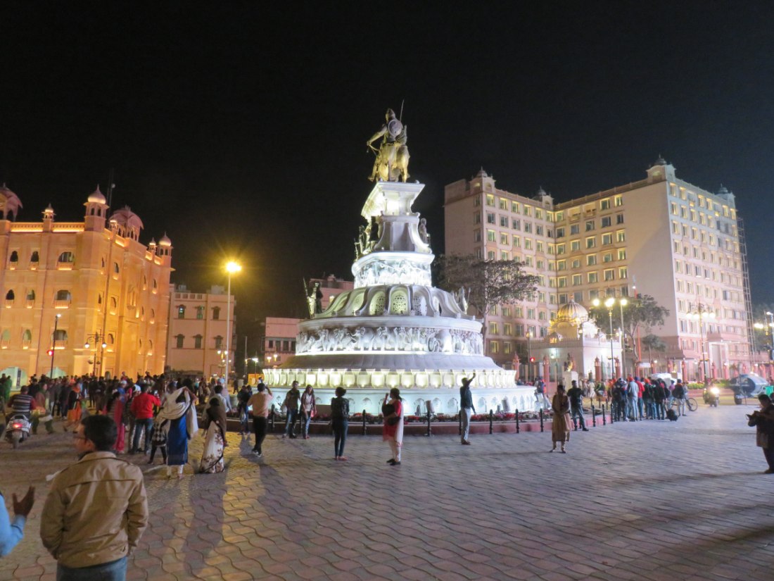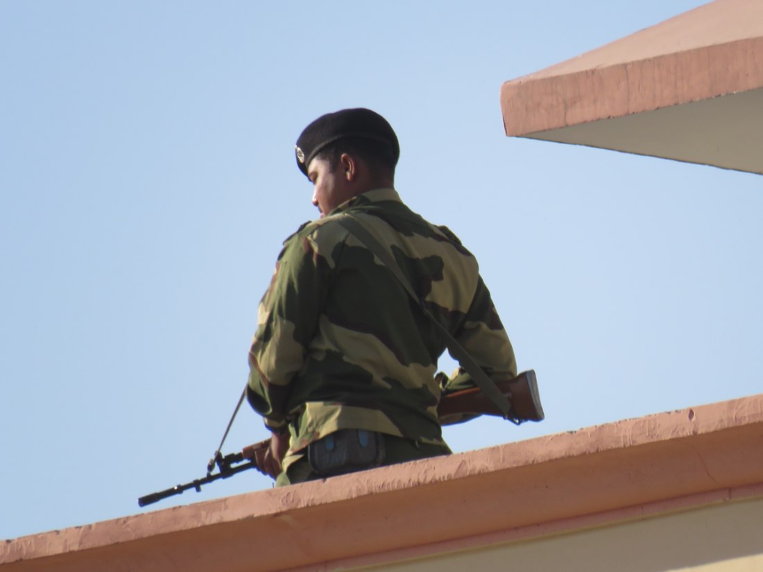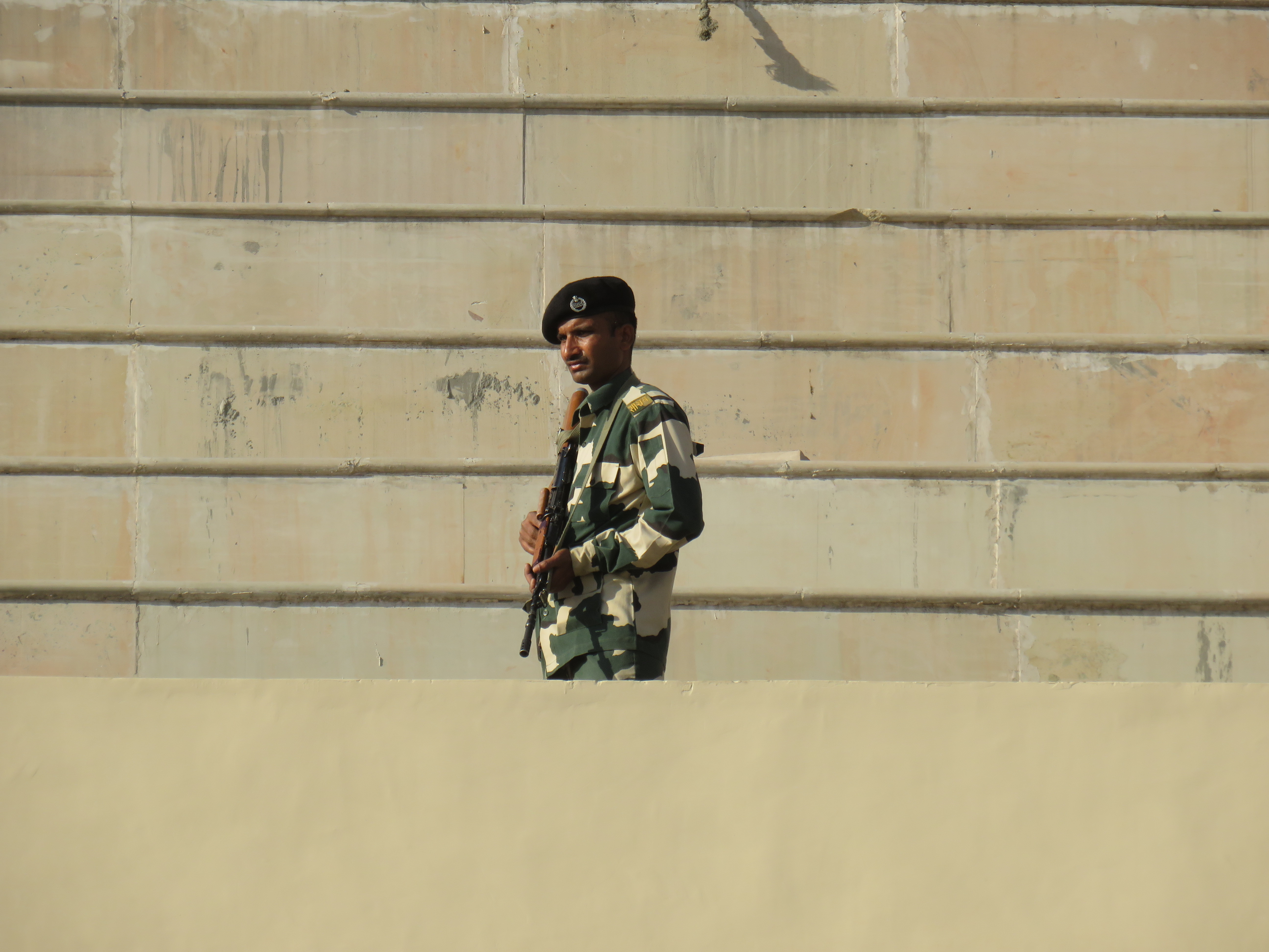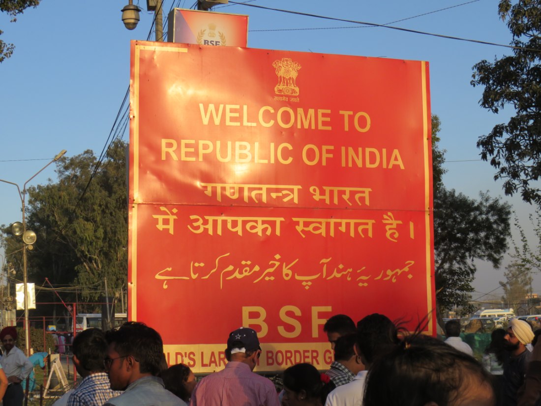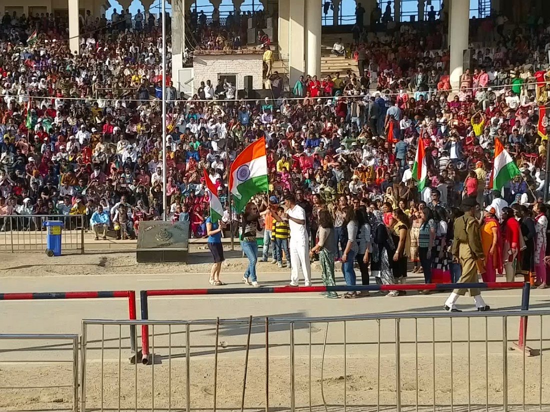 Relève de la garde à Attari sur la frontière avec le pakistan. Après avoir passé un poste de contrôle et de nombreux militaires, grande parade-spectacle devant une foule colorée de plusieurs milliers de personnes en liesse, sous bonne garde dans une arène en phase d'agandissement.