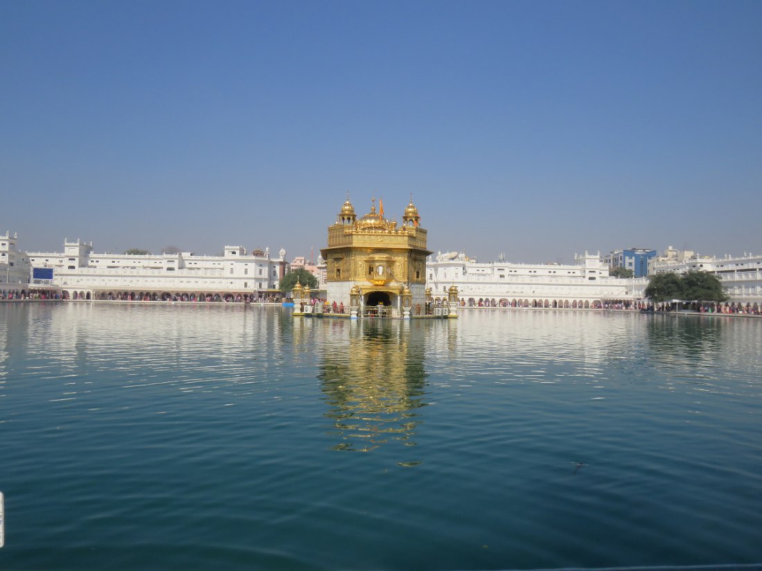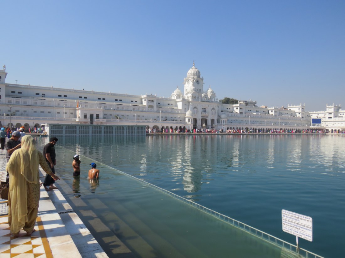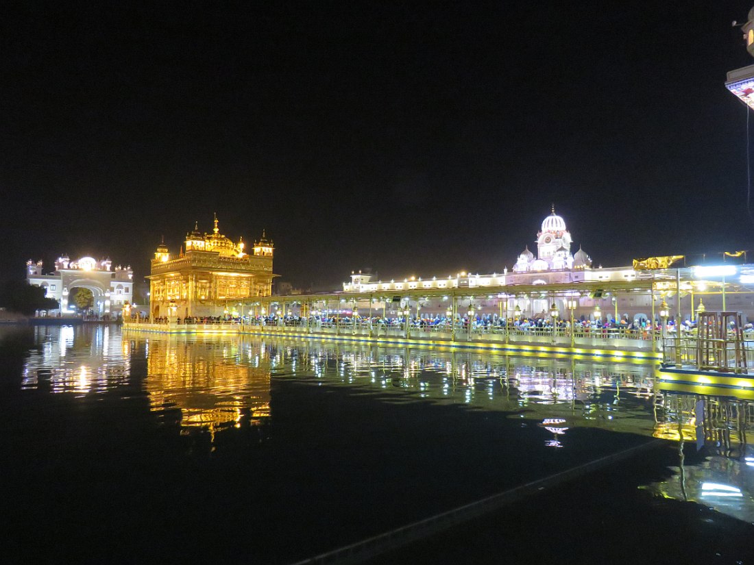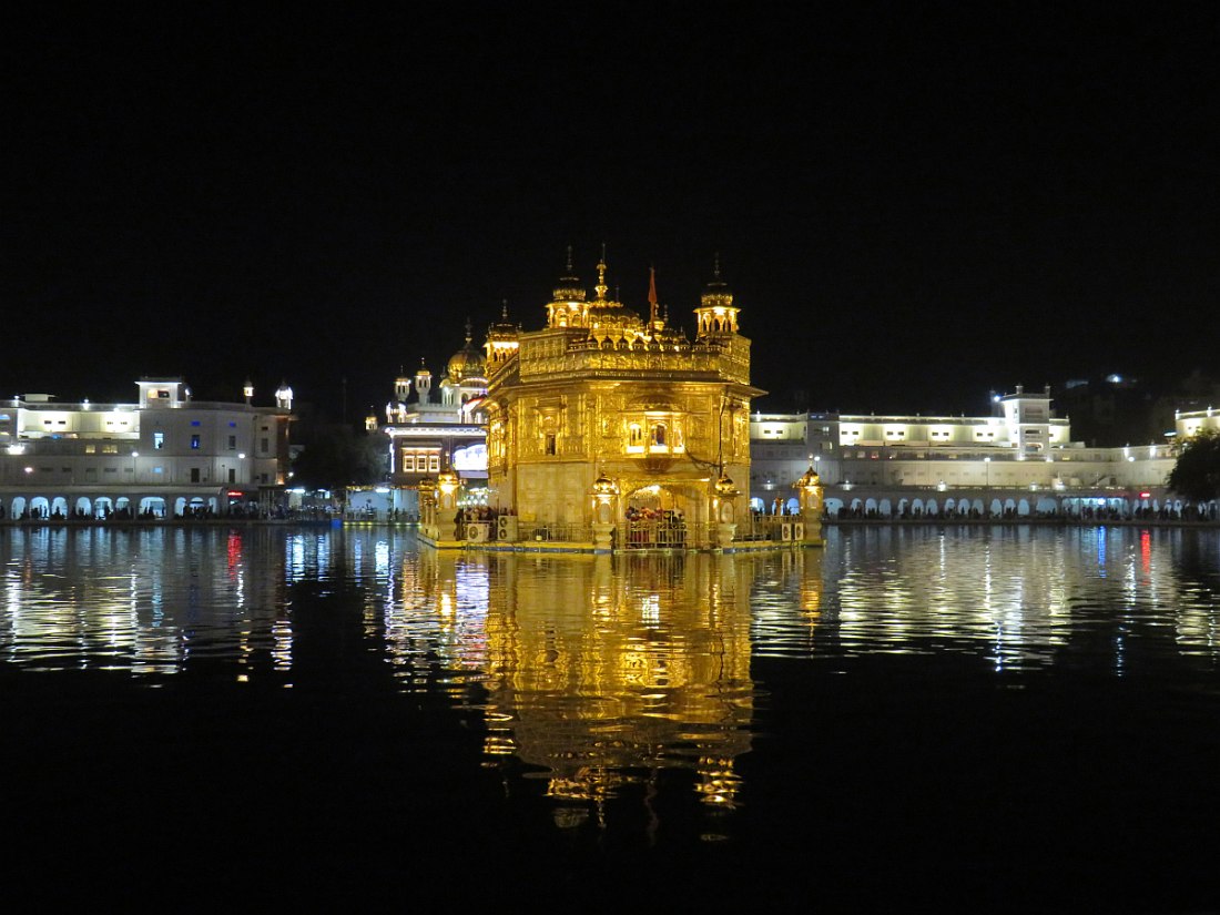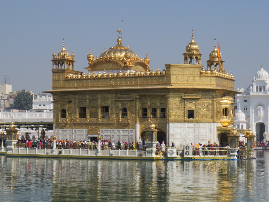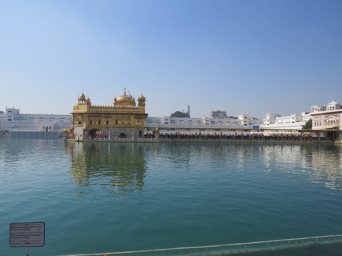 LE TEMPLE D'OR - Situé à un point bas de la ville, comme pour signifier qu'il accueille naturellement tous les disciples. Il trône au centre d'un bassin sacré de forme carrée de 150 mètres de côté, l’Amrit Sarovar. On accède au bassin par quatre entrées qui symbolisent son ouverture à tous les peuples et toutes les croyances. Le temple est entouré d'un vaste complexe comprenant des gurdwârâs (lieux de culte Sikh), des réfectoires où des repas gratuits sont offerts aux pèlerins, un musée, etc.