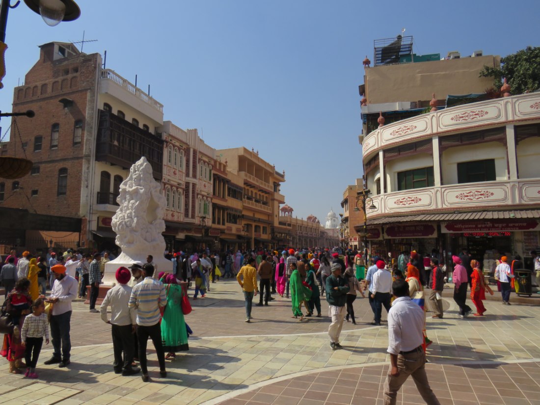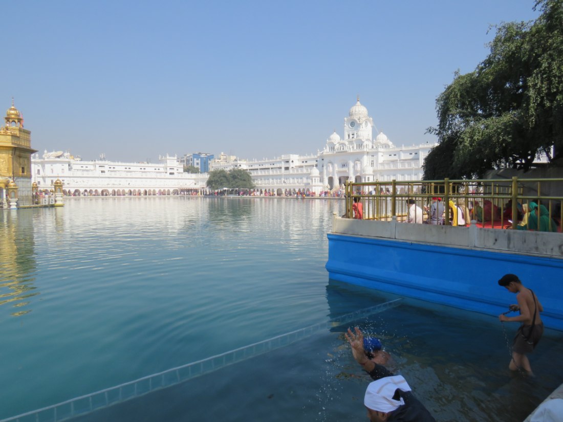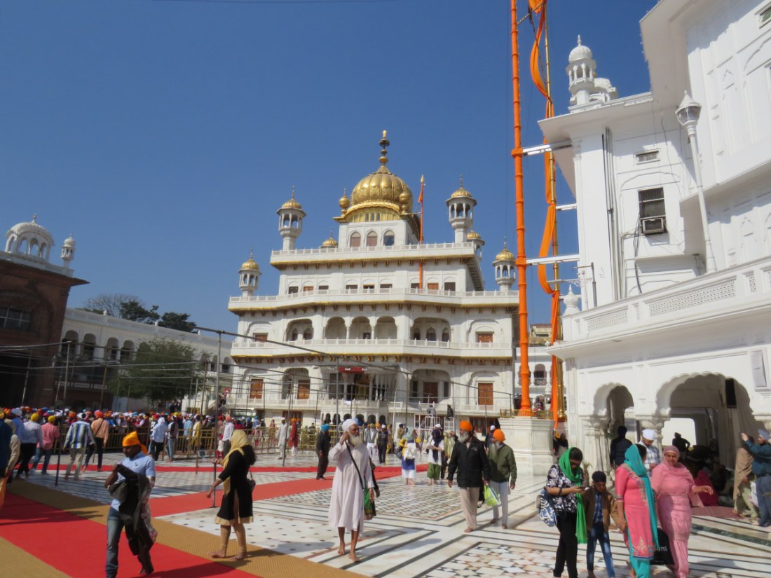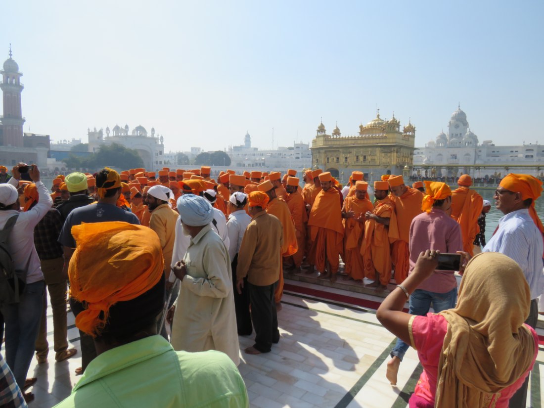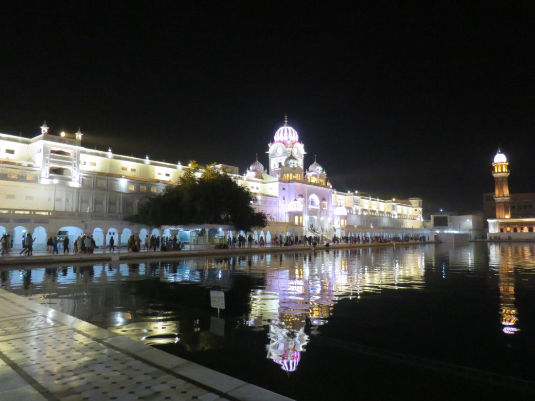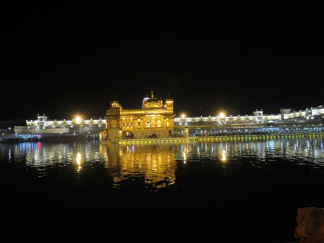 LE TEMPLE D'OR - Situé à un point bas de la ville, comme pour signifier qu'il accueille naturellement tous les disciples. Il trône au centre d'un bassin sacré de forme carrée de 150 mètres de côté, l’Amrit Sarovar. On accède au bassin par quatre entrées qui symbolisent son ouverture à tous les peuples et toutes les croyances. Le temple est entouré d'un vaste complexe comprenant des gurdwârâs (lieux de culte Sikh), des réfectoires où des repas gratuits sont offerts aux pèlerins, un musée, etc.