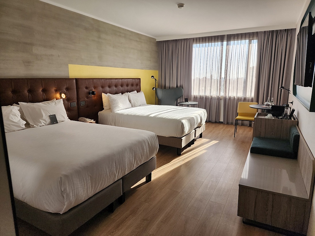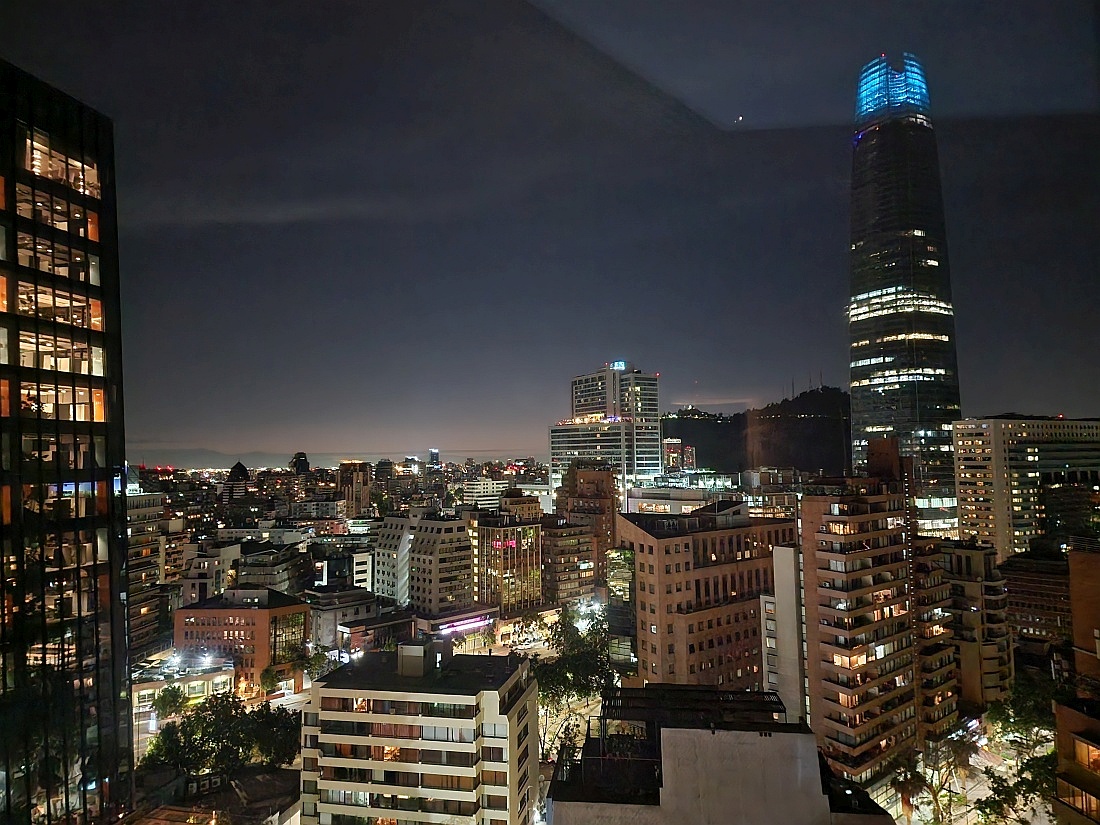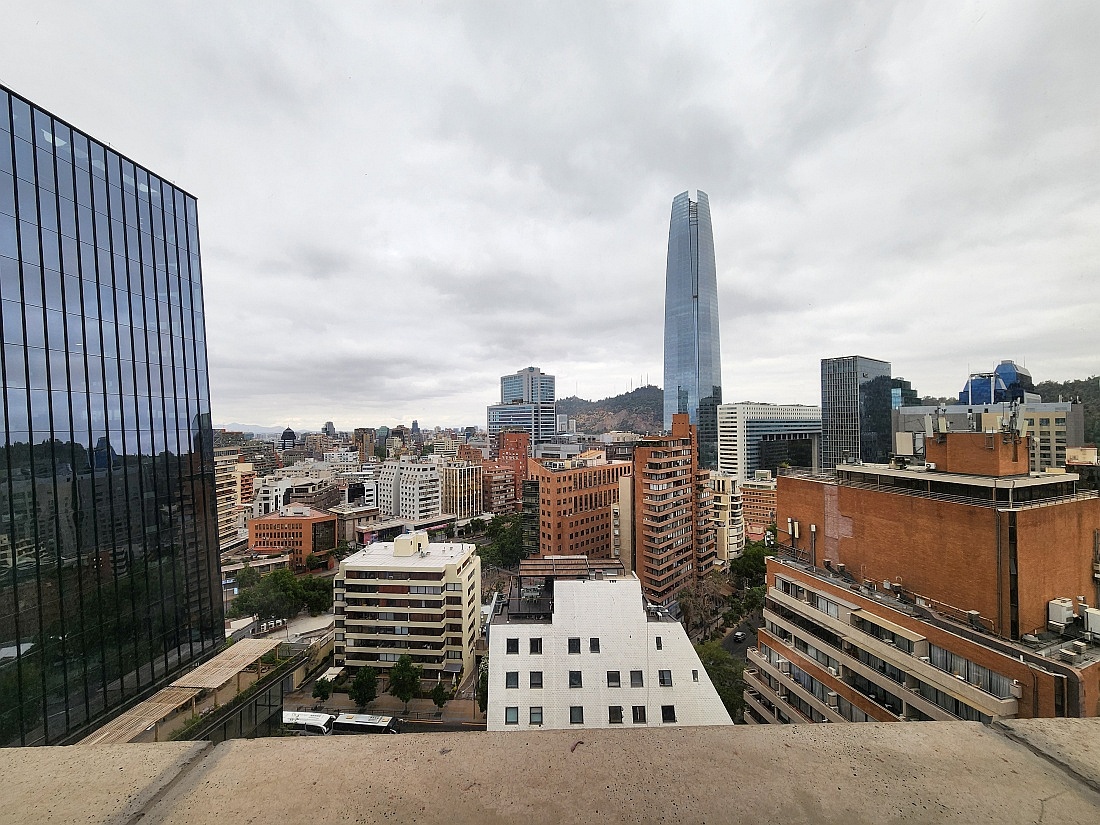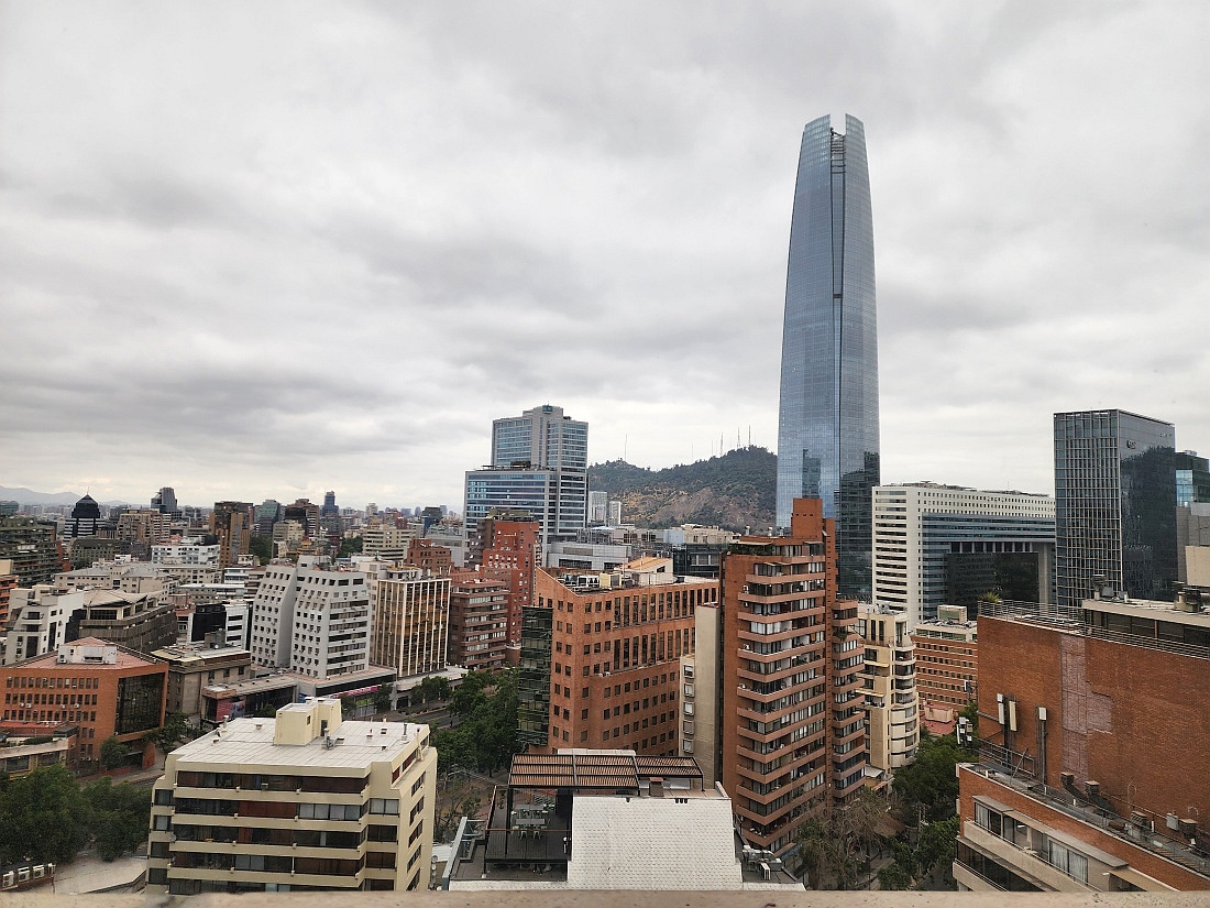 Vue sur la Gran Torre Santiago, la plus haute tour d'Amérique Latine avec 300 mètres, restaurant au plus haut