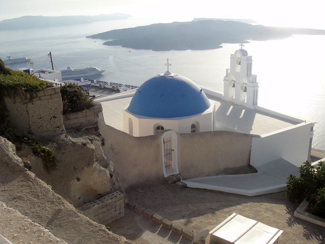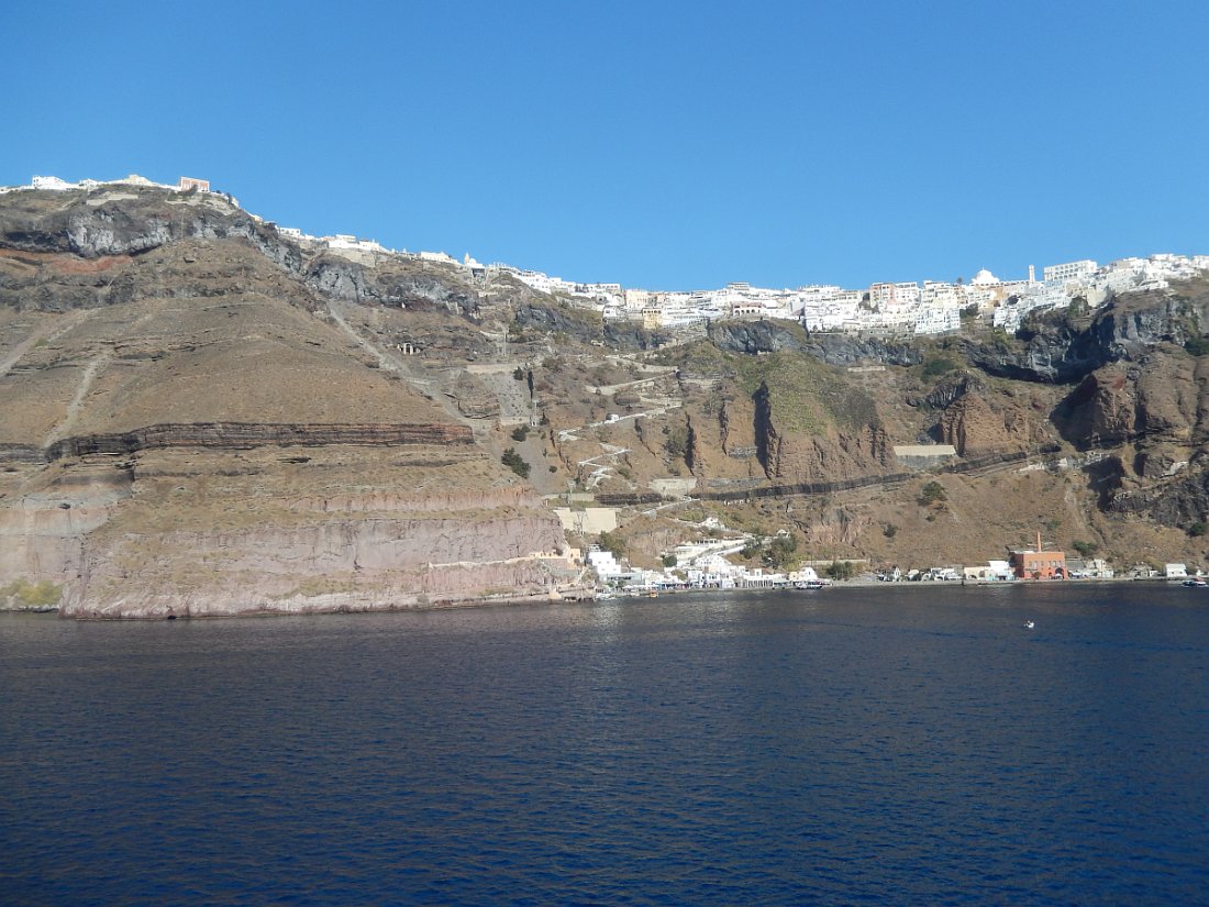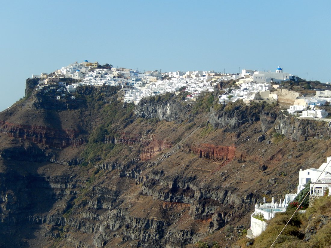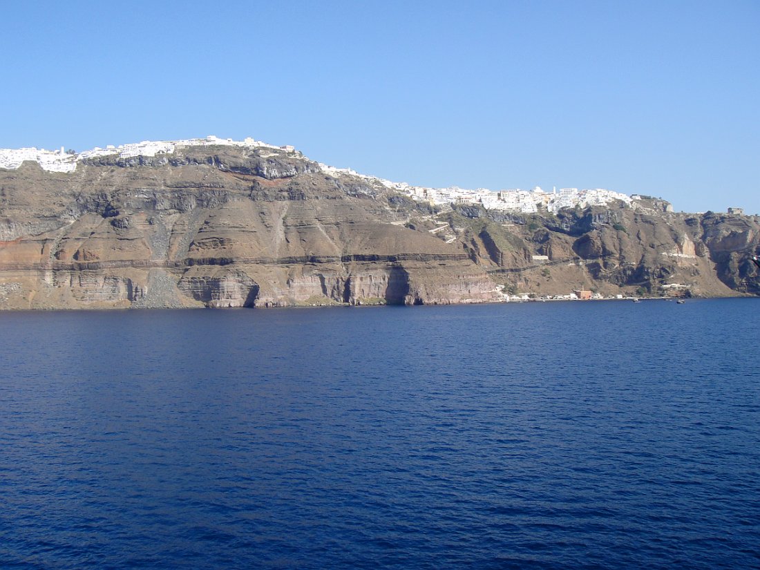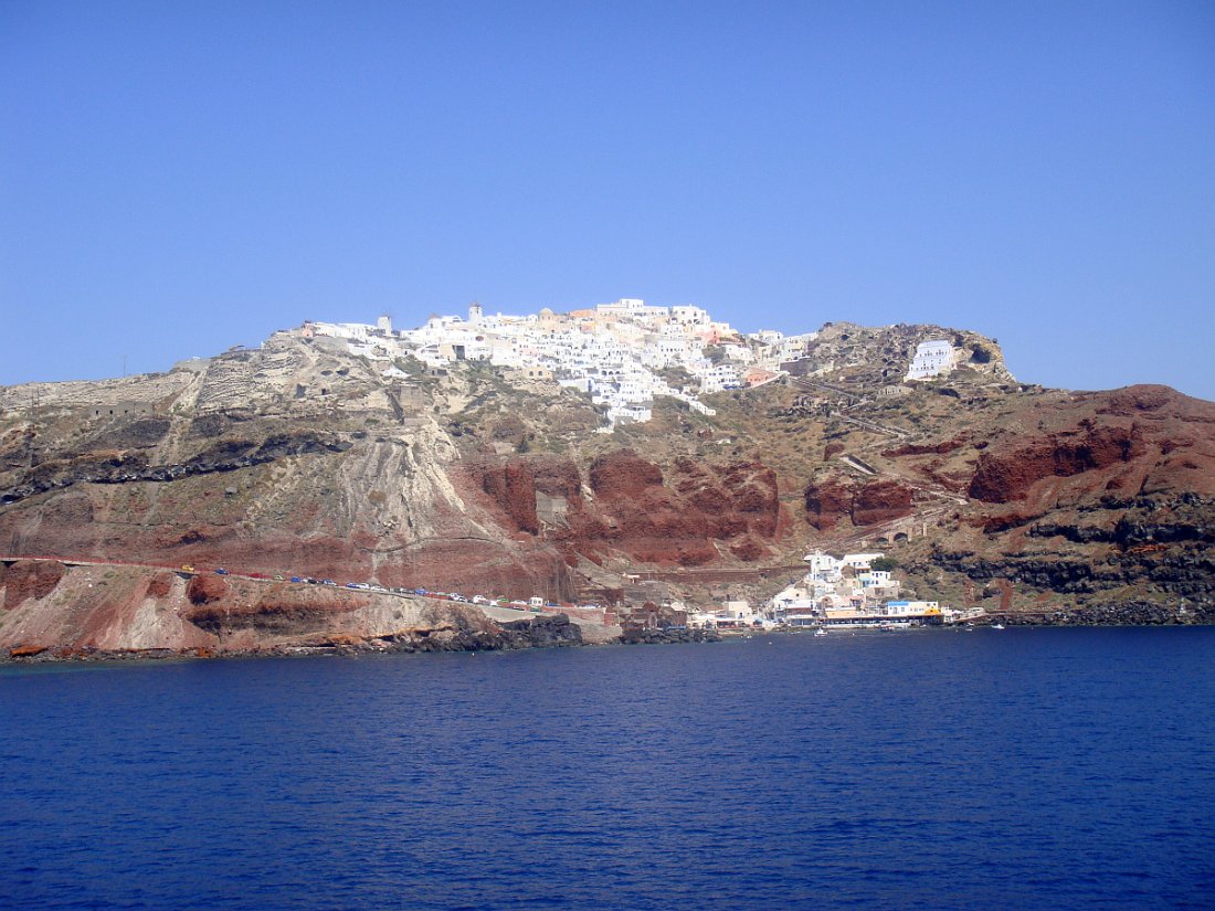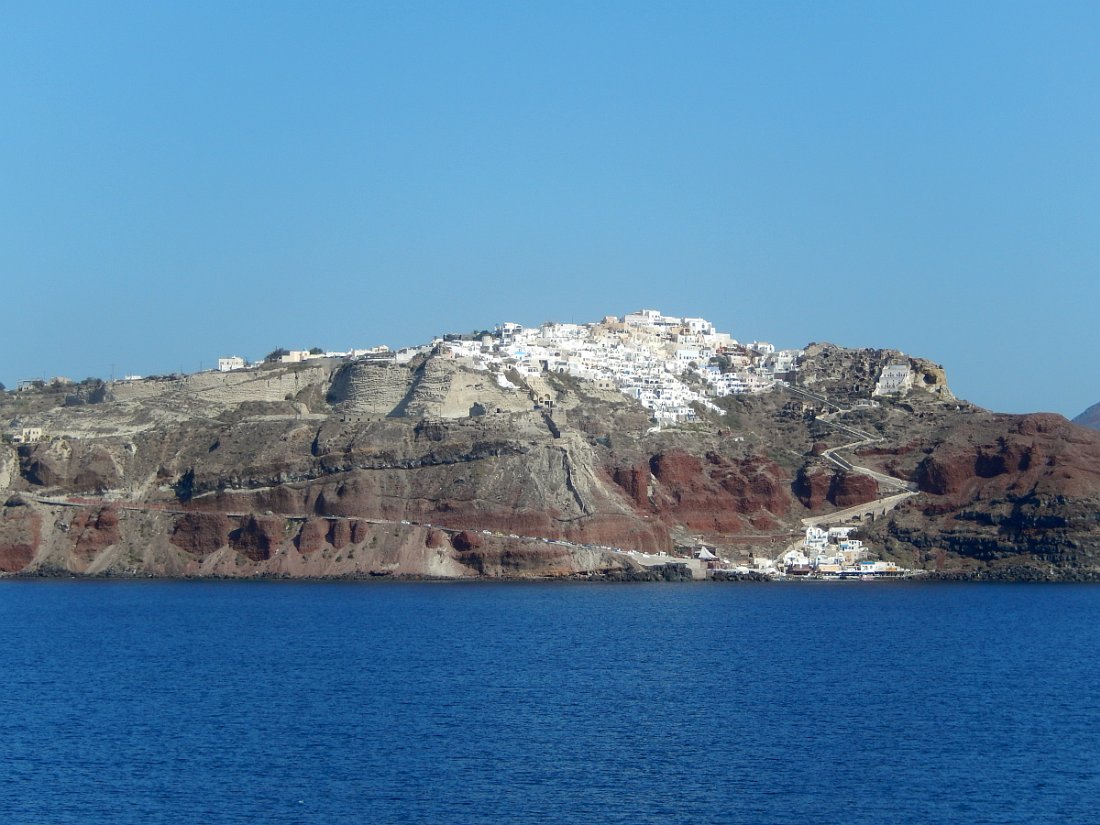 Ile détruite par une éruption volcanique au XVIème siècle av. J.-C., qui a façonné ses paysages accidentés. Les maisons blanches en forme de cube de ses 2 villes principales, Fira et Oia, sont accrochées sur des falaises surplombant une caldeira (cratère) sous-marine.