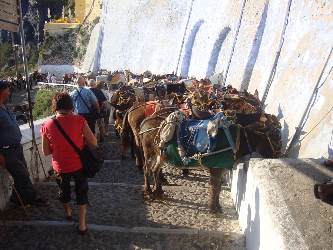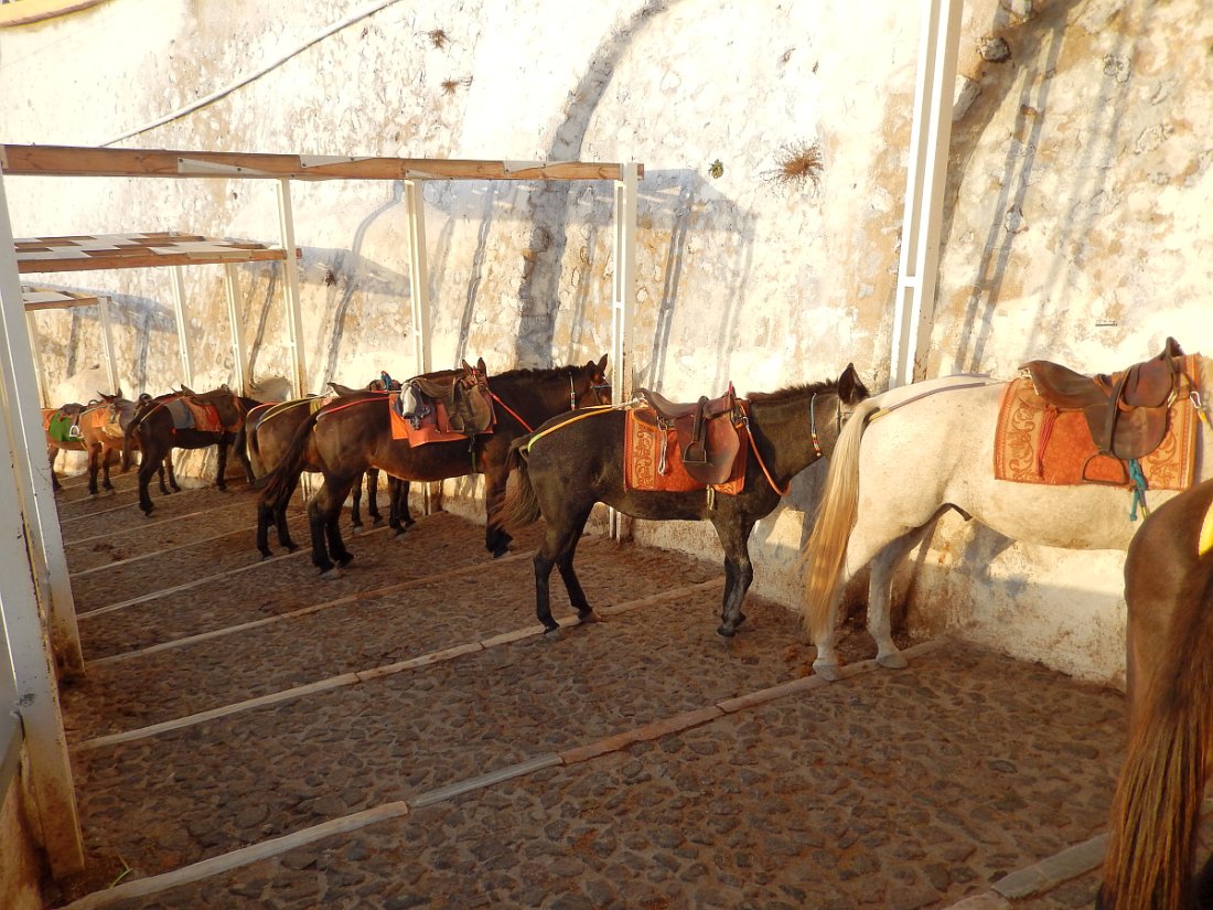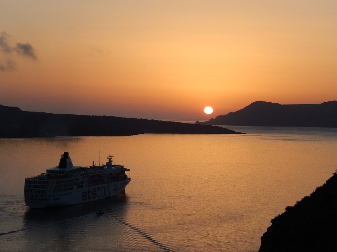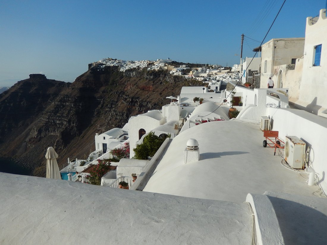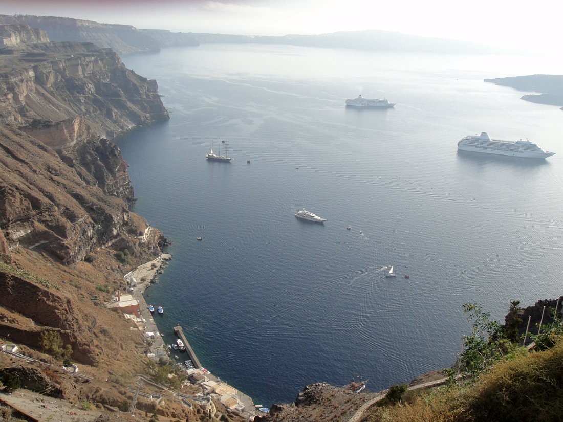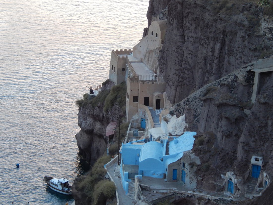 Ile détruite par une éruption volcanique au XVIème siècle av. J.-C., qui a façonné ses paysages accidentés. Les maisons blanches en forme de cube de ses 2 villes principales, Fira et Oia, sont accrochées sur des falaises surplombant une caldeira (cratère) sous-marine.