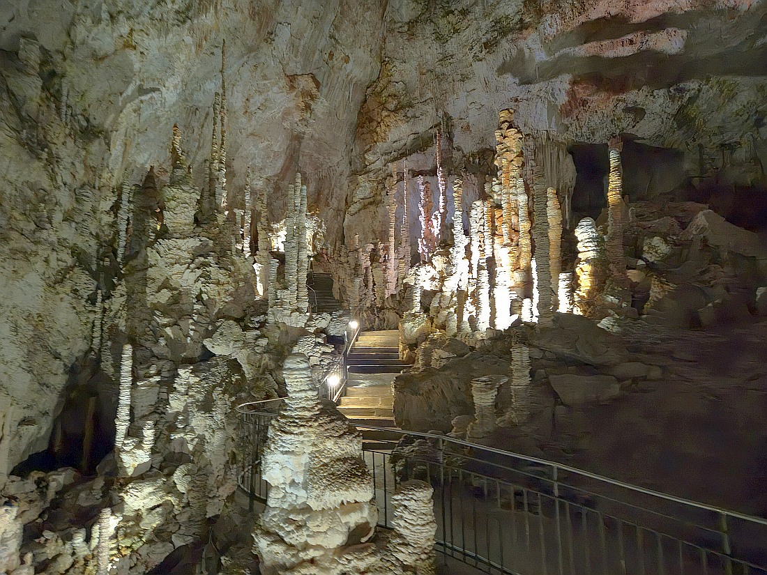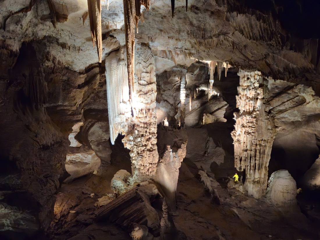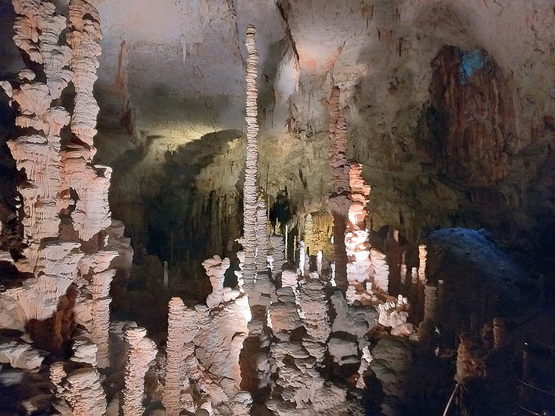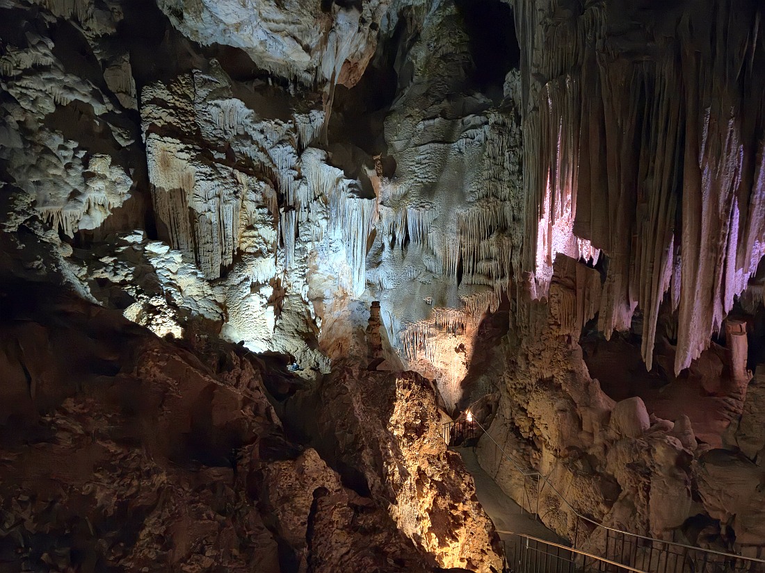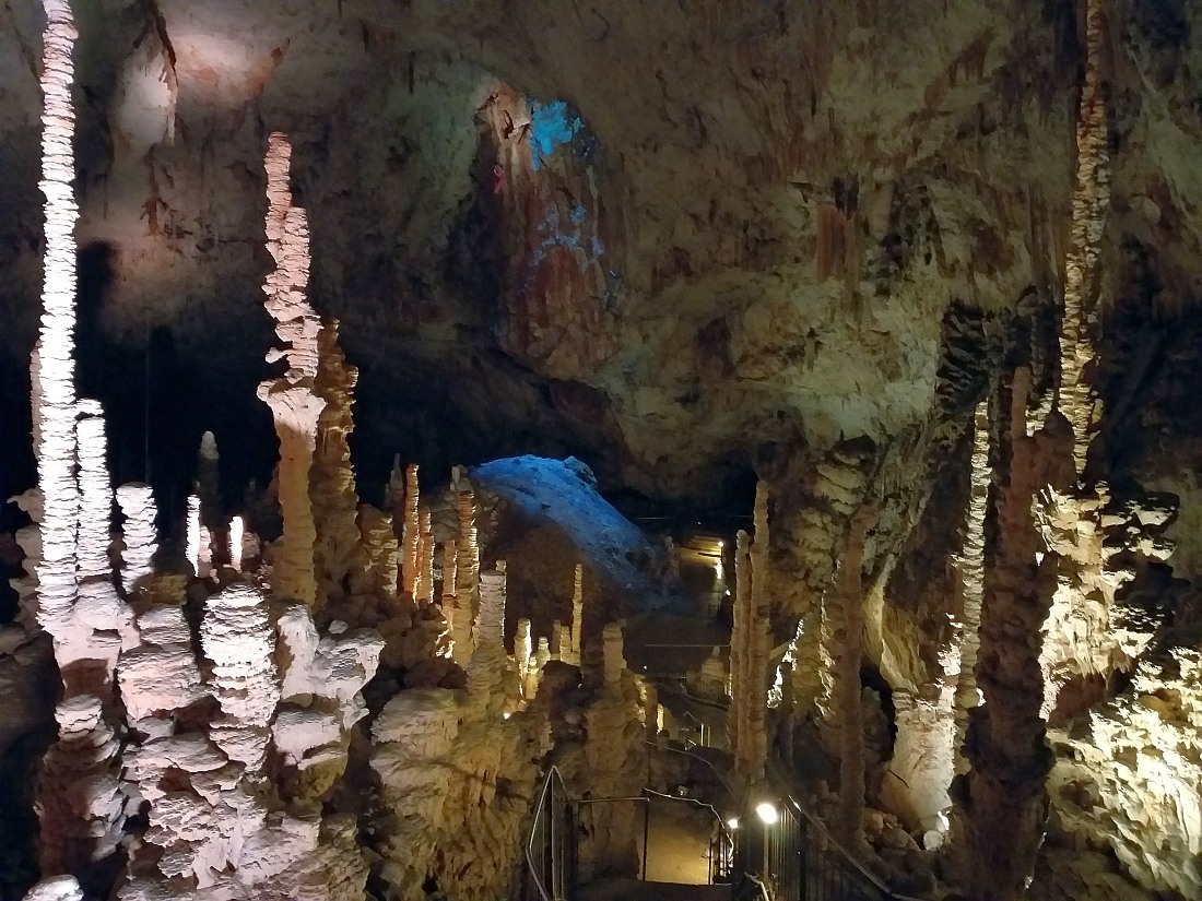 GRAND SITE DE FRANCE sur la commune d'Orgnac-l'Aven, à deux pas des gorges de l’Ardèche et au coeur d’un écrin de verdure, la grotte majestueuse et la Cité de la préhistoire, batiment moderne, permettent d'explorer l’oeuvre de la nature et de voyager jusqu’à nos origines. Aires de jeux et de pique nique, restauration, souvenirs et produits locaux sur place. La découverte de l'aven a été faite par Robert de Joly le 19 août 1935, ouverte au public le 11 juillet 1939. Le 14 avril 1940, la commune change de nom et devient Orgnac-l'Aven. En 1955, le parcours touristique s'agrandit pour atteindre près d'un kilomètre. En 1948, un bâtiment de réception est construit, en 1965, installation de l'ascenseur qui descend depuis le hall d'accueil jusqu'au tunnel horizontal d'accès, ce qui évite la remontée par les 700 marches de l'escalier. En 1965-1966, découverte de près de 4 km de nouveaux réseaux. En 2004, le site est labellisé Grand Site de France. En 2014, la Cité de la Préhistoire, musée "nouvelle version" ouvre. L’entrée naturelle est un trou qui se situe au milieu des chênes verts et qui mène à la première salle de la grotte dont le plafond s’élève à près de 30 mètres, tout en se situant à une cinquantaine de mètres sous la surface.