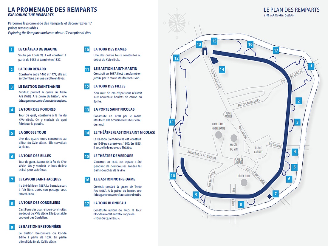 Sous préfecture de la Côte d'Or, capitale des vins de Bourgogne, "Ville d’Art et d’Histoire" avec pas moins de 34 monuments classés ou inscrits au titre des "Monuments Historiques" dont les magnifiques Hospices de Beaune (ou hôtel-Dieu de Beaune), de style gothique flamboyant avec toiture en tuile vernissée de Bourgogne, fondés dès 1452 par le chancelier des ducs de Bourgogne, Nicolas Rolin et son épouse Guigone de Salins. Ce qui va donner une dimension humaniste à la ville puisque les hospices accueillent uniquement les grands malades et les déshérités. A partir du XVème siécle, la ville connait un véritable essor économique, politique et financier. En 1477, le retour de la Bourgogne à la France de Louis XI entraine une campagne de fortification. Une première phase de construction, entre 1478 et 1502, établit la citadelle et une première enceinte. De 1513 à 1524 sont érigées les grosses tours aux angles de la cité et l'enceinte est épaissie. Elle est entourée de fossés en eau et on dénombre neuf portes et six tours. Une dernière phase en 1636 modernise les fortifications en ajoutant des bastions. Les chemins de campagne et les collines recouvertes de vignes menant à Beaune donnent un aperçu du charme de cette cité tout droit sortie d'un conte de fées avec ses remparts qui font encore le tour du centre ancien, son architecture médiévale, ses rues pavées et ses anciennes caves à vin. A Beaune, depuis 1840, la "Moutarderie Fallot" dernière moutarderie artisanale de Bourgogne perpétue un savoir-faire unique. Le 4 juillet 2015, les Climats du vignoble de Bourgogne ont été inscrits sur la liste du Patrimoine mondial de l’Unesco.