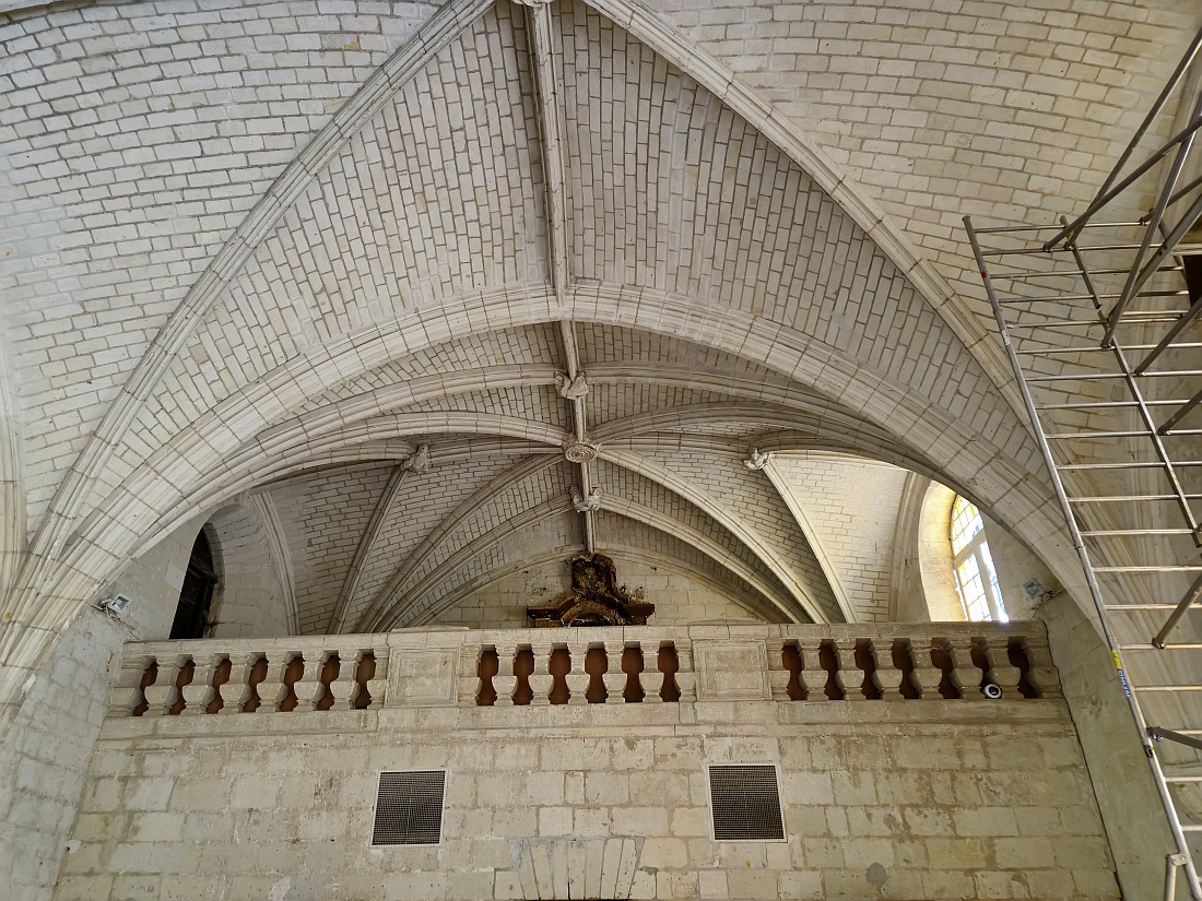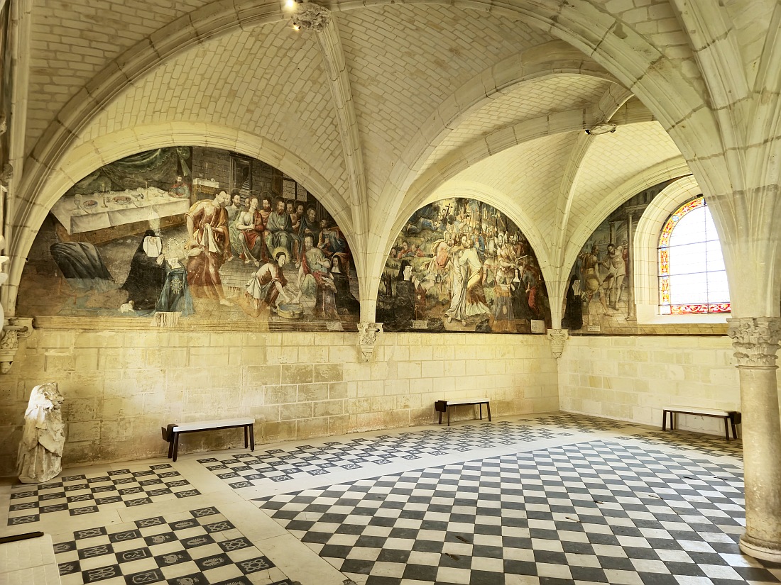 "Un des plus beaux villages de France" du Maine et Loire, situé aux confins de trois provinces: Poitou, Anjou et Touraine, il abrite l'abbaye royale de Fontevraud, l’une des plus vastes cités monastiques d'Europe, elle s'étend sur 13 hectares. En 1101, Robert d'Arbrissel, protégé par le comte d’Anjou, Foulque V, fonde une abbaye accueillant frères et moniales. Il en essaime rapidement de nombreux prieurés sur un territoire allant de l’Angleterre à l’Espagne. Situé à la frontière de l’Anjou, au coeur de leurs territoires, le lieu devient, à partir de 1189, la nécropole royale des Plantagenêts, abritant les sépultures d’Henri II, d’Aliénor d’Aquitaine, d'Isabelle d'Angoulême et de Richard Coeur de Lion. Dans l'église abbatiale, il ne reste que les gisants, les dépouilles ont disparu quand l'abbaye a été fermée et pillée à la révolution. La gouvernance de l’abbaye est confiée à une abbesse, durant près de 7 siècles, 36 abbesses, issues de la haute noblesse, s’y succèdent. Après la révolution, suivent douze ans d’abandon et de pillages et ensuite 10 ans de travaux, pour transformer l'ensemble en prison qui accueille près de 2800 prisonniers, jusqu'en 1963, où débute un vaste chantier de restauration qui s’échelonne sur plusieurs décennies. Depuis 2000, elle est inscrite au Patrimoine Mondial de l’UNESCO avec l’ensemble du Val de Loire.